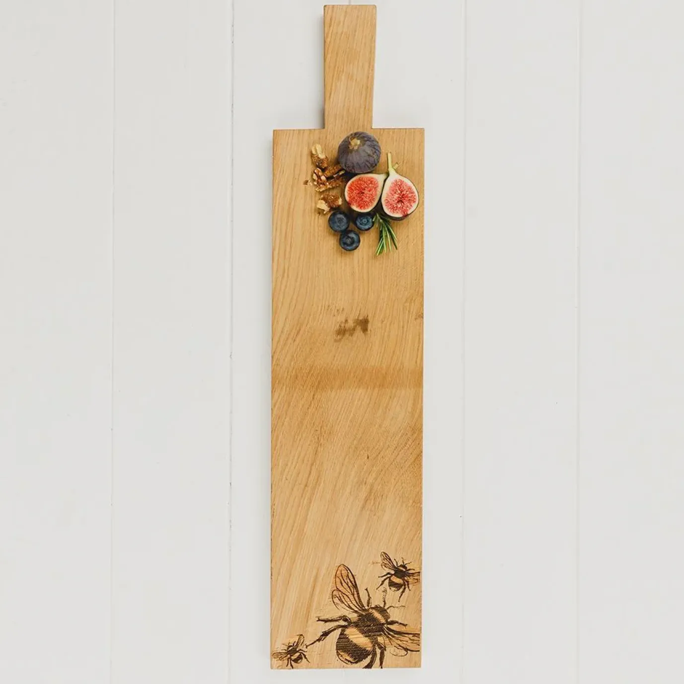 Featuring engraved bees, this serving paddle is a great way to add country charm to your kitchen and dining table. This hand crafted Scottish Oak serving paddle is 65cm/25.5 inches long, so you can prepare and present generous amounts of whatever you fancy – breads, cold meats, cheeses, nibbles, snacks or antipasti of any kind. With it’s stunning slim and elongated design you can create an impressive table presentation when entertaining at home.