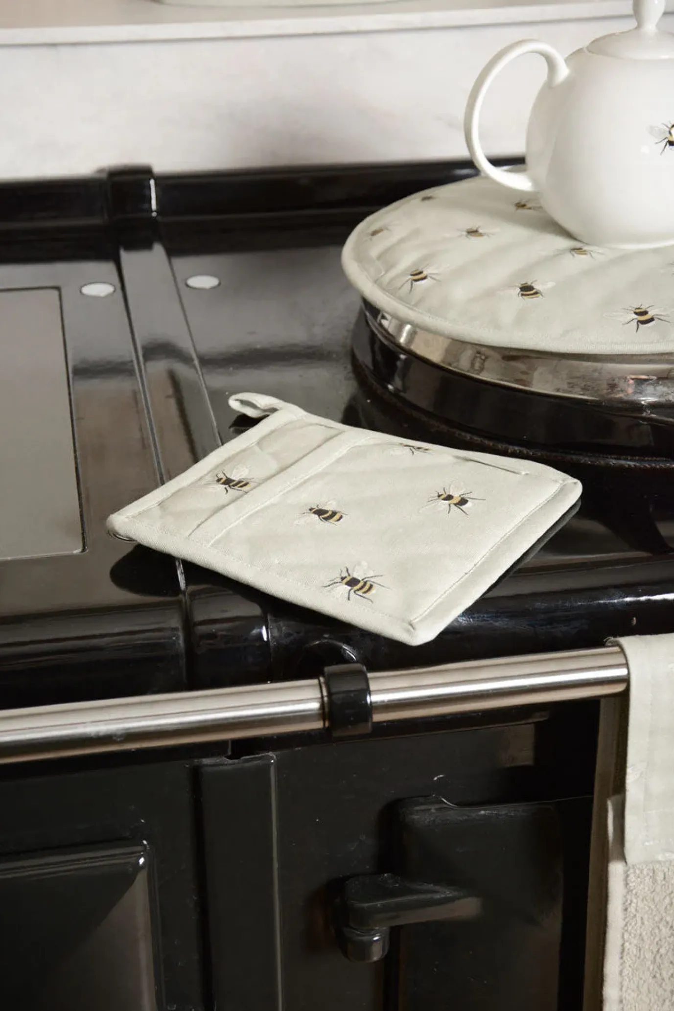 Sophie Allport Bees pot grab will protect your hands while lifting hot pans and dishes. Covered in bees on a pale grey-green background it is made from 100% cotton and the internal padding gives you excellent insulation.