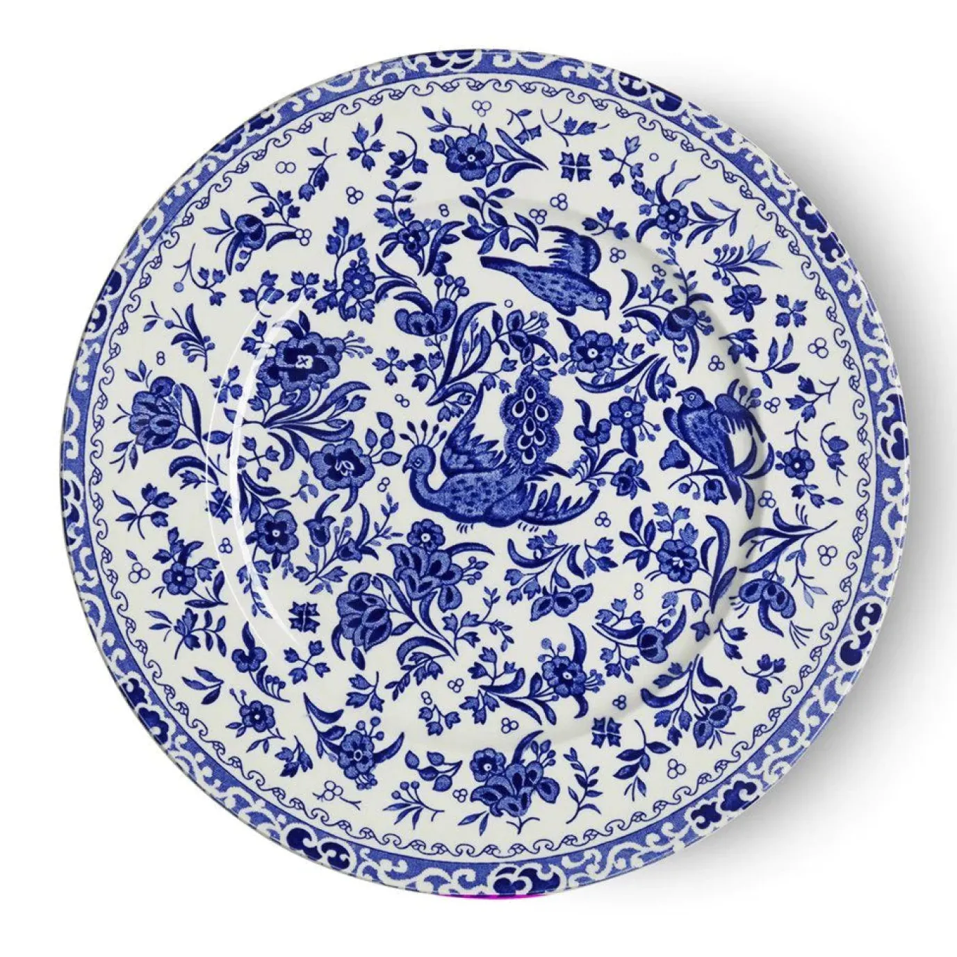 Decorated in an eye-catching oriental bird pattern, this Blue Regal Peacock Plate makes a beautiful addition to the dinner table. The striking palette of blue and white brings splendor and refinement with every course.