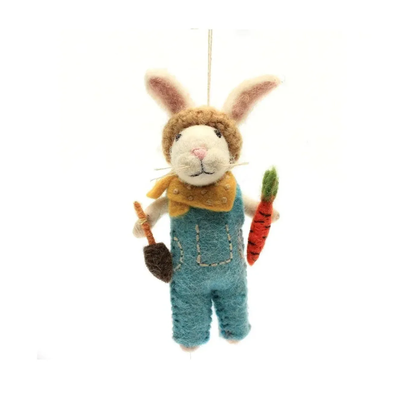 A handmade Bunny with Trowel & Carrot Felt Hanging Decoration from Amica Felt to add a dash of cheeky charm to your Easter or Spring decor. This gardening bunny wears smart blue dungarees, with a crunchy carrot in one paw and a trowel in the other.