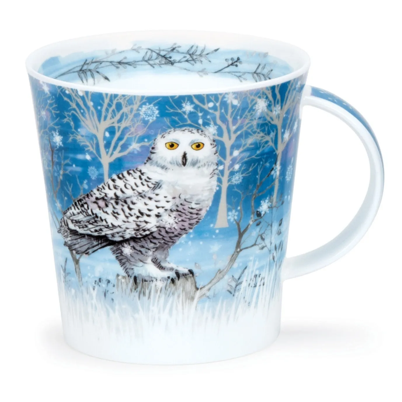 This Moonlight design features as striking snowy owl with piercing yellow eyes sitting proudly atop a wintry tree stump amongst silvery trees while snowflakes delicately and silently fall to the ground.