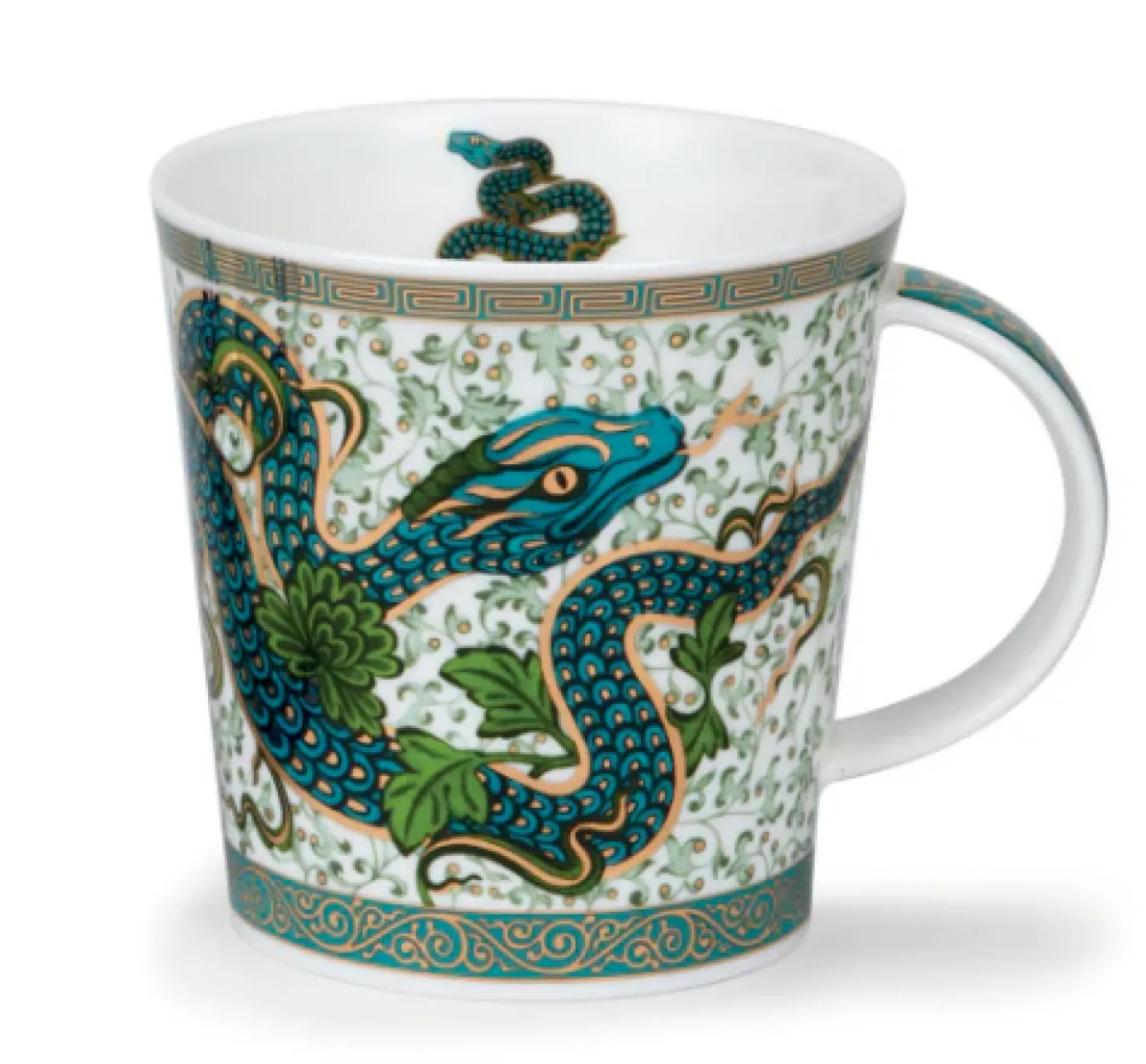 Inspired by 15th century Chinese pottery, our majestic snake is in shades of greens and blues, interlaced with 22 carat gold decoration and delicate green foliage