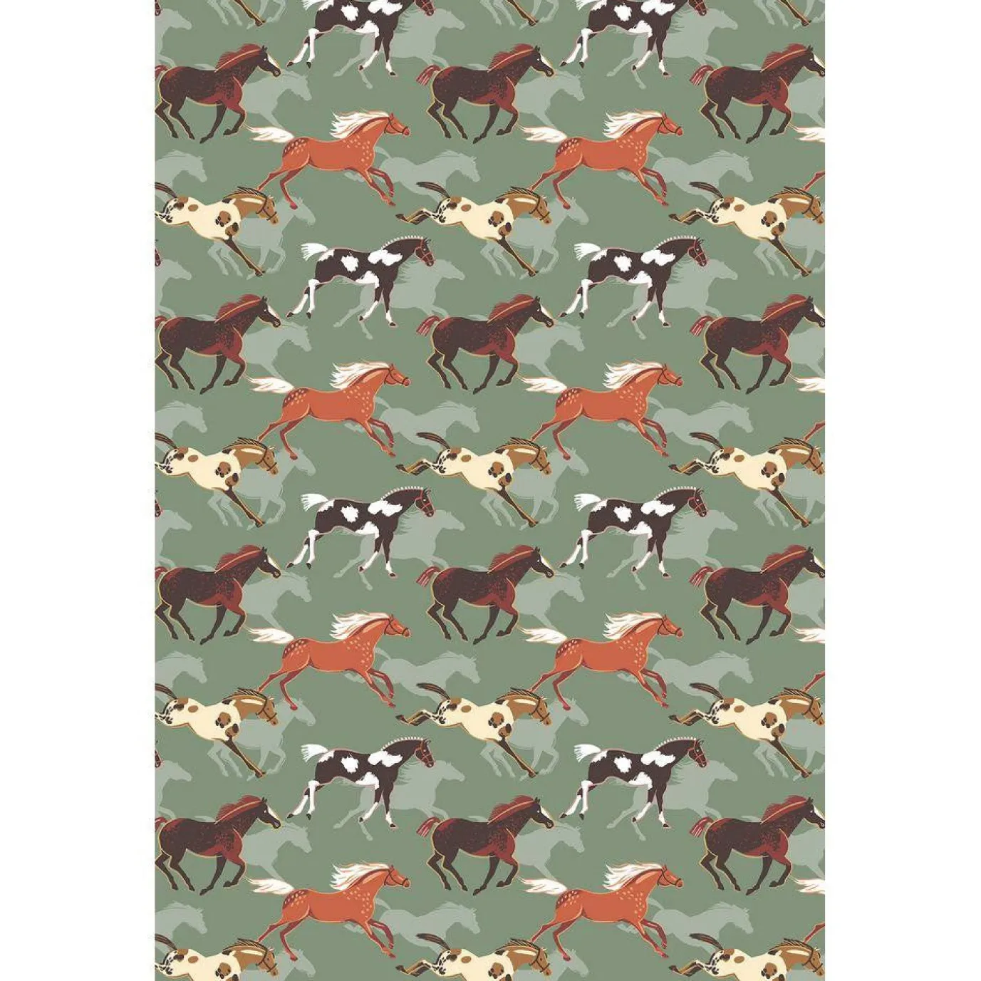This design was made with horse lovers in mind. It features four majestic horses as they gallop across a green meadow, with their manes and tails blowing in the wind. The pattern resembled a camo print, making this a great design for a country kitchen.