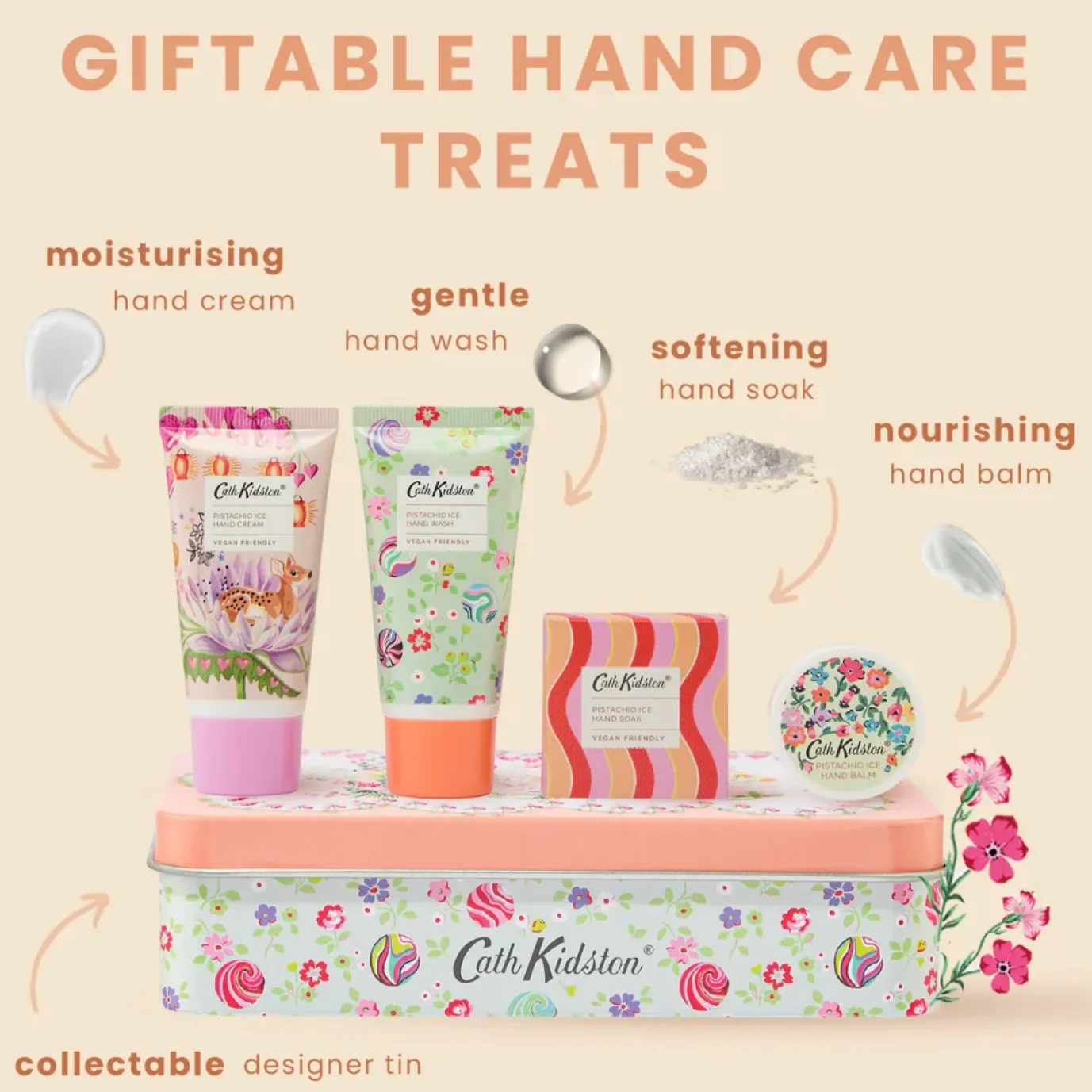 An enchanting giftable tin with loveable hand-painted animals, filled with delicious Pistachio Ice hand cream, hand wash and hand balm with essential oils of sweet orange and balsam.