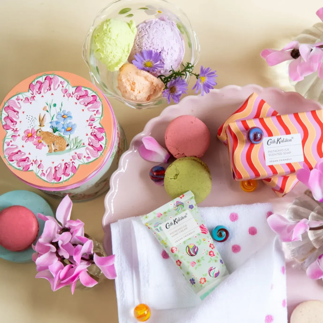 Be the perfect host with this joyful collectible tin filled with polka dot cotton hand towel, vegan hand cream and two soaps with irresistible Pistachio Ice fragrance. A pampering treat for guests.