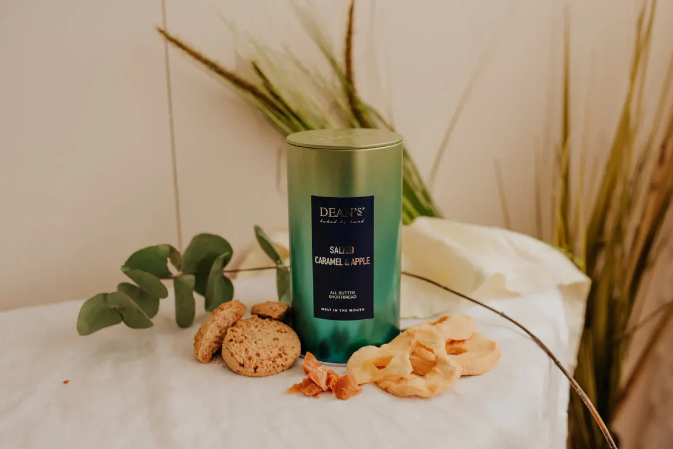 Inspired by the beauty of the aurora borealis, this striking Aurora tin contains all butter shortbread rounds, hand baked with salted caramel, oatflakes, and apple.