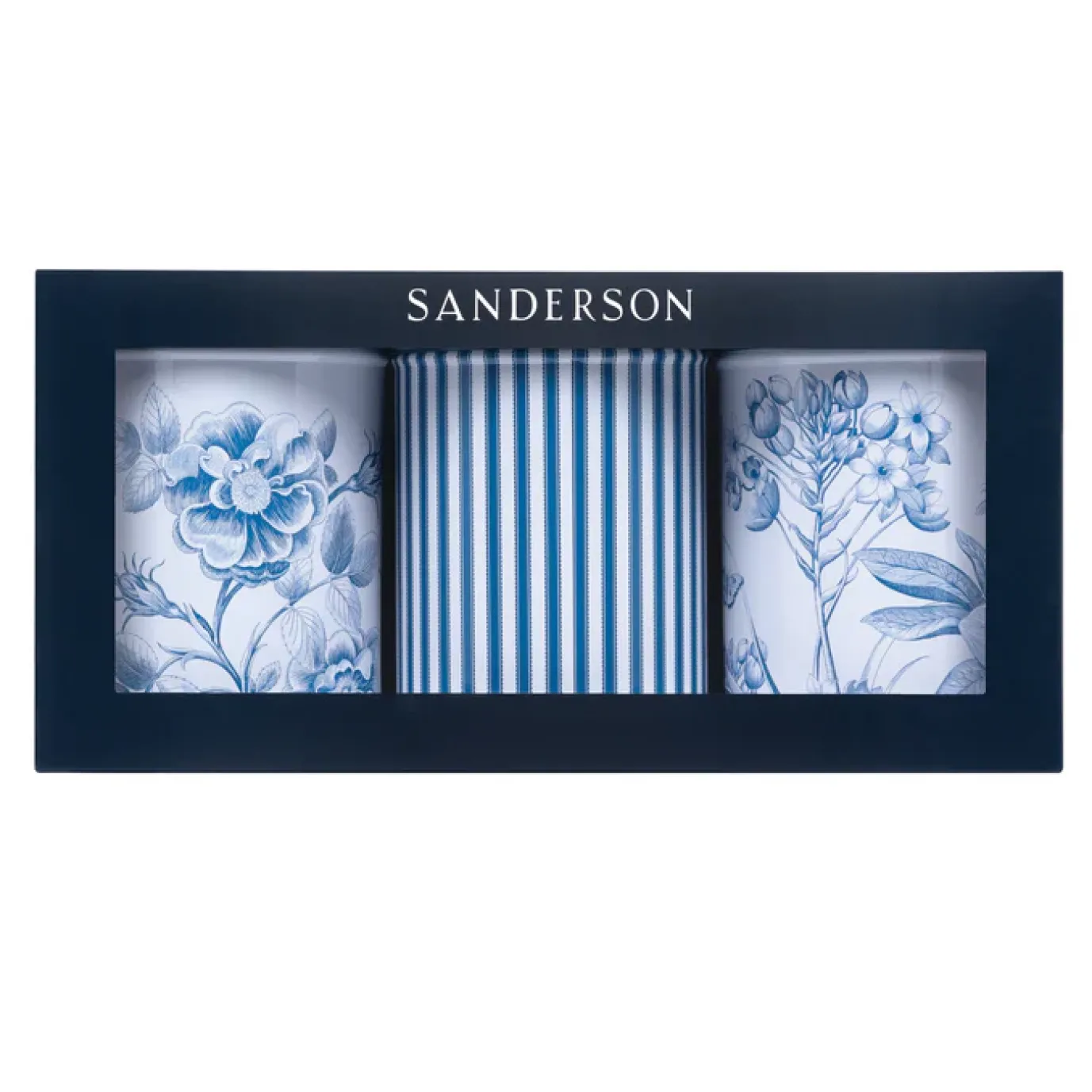 This Sanderson Set of 3 Caddies features an elegant and simple design of blue flowers with butterflies and bees with a striped design on one tin. Coordinate with other items in the Etchings & Roses design collection.