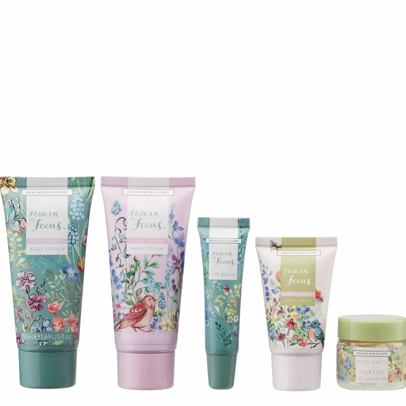 Hand Cream 50ml, Body Lotion 50ml, Foot Cream 30ml, Bath Salts 30g, Lip Balm 10ml