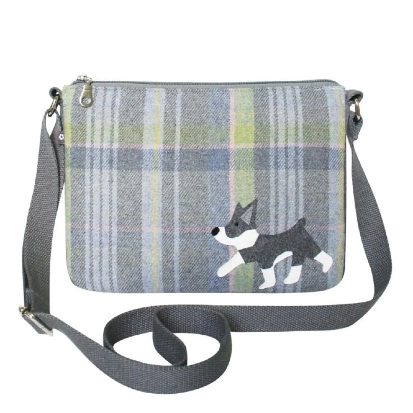 Grey with pink Tweed messenger bag with grey & white dog applique design by Earth Squared. This bag is a cross body style with adjustable strap, zipped main compartment, integrated phone pouch inside and two slip pockets on the back.