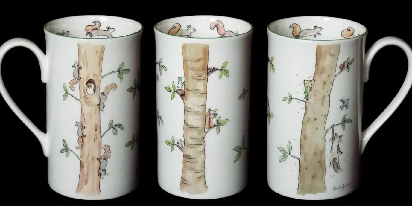 A whimsical Bone China mug by artist Anita Jeram. Depicts tree trunks with animals and wildlife going about their daily business! The unusual shape holds 10 fl oz and is hand decorated in Staffordshire, England.