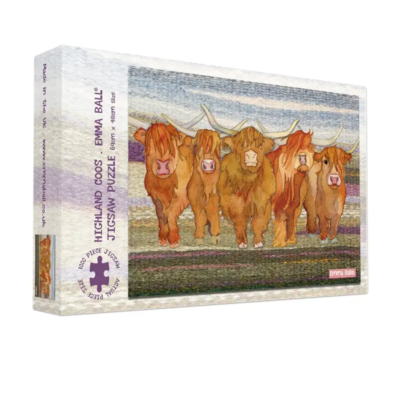 This design features Emma Balls felted Highland Cow. This 1000-piece jigsaw measures 69 x 48cm when made. Supplied in a high-quality 33 x 20 x 5cm box, the perfect gift for a jigsaw lover. These jigsaws are made with 1.75mm luxury recycled board, with a matt finish (no flimsy cheapy pieces here!)