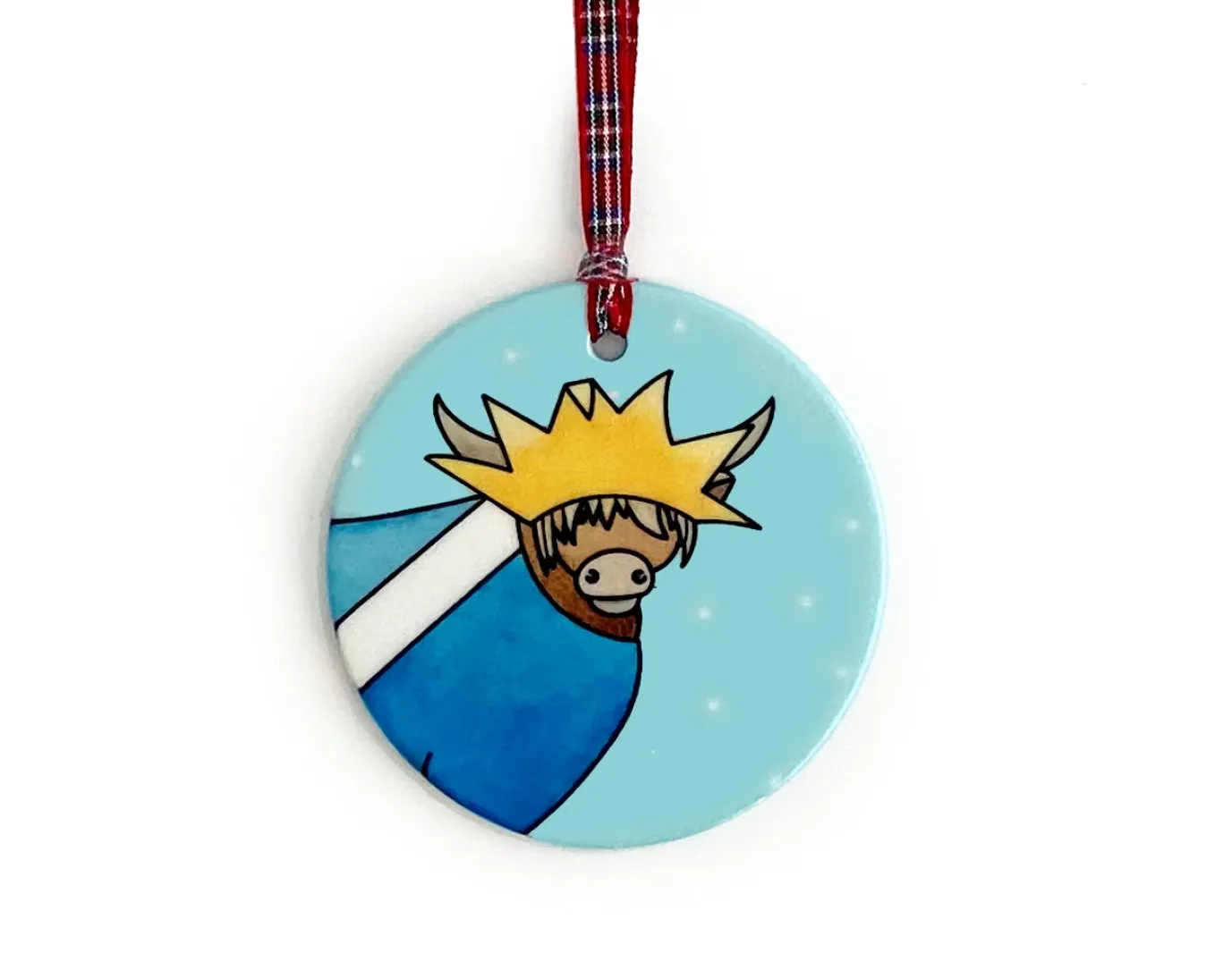 Each Christmas tree decoration features a Highland cow in a Christmas themed outfit. Measuring approximately 7.5cm x 7.5cm (3in) these double sided, hand-printed ceramic ornaments are available in 4 fun designs: Saltire onesie, Reindeer reigns, Santa outfit or a kilt. Each ornament comes with a red tartan ribbon to hang.