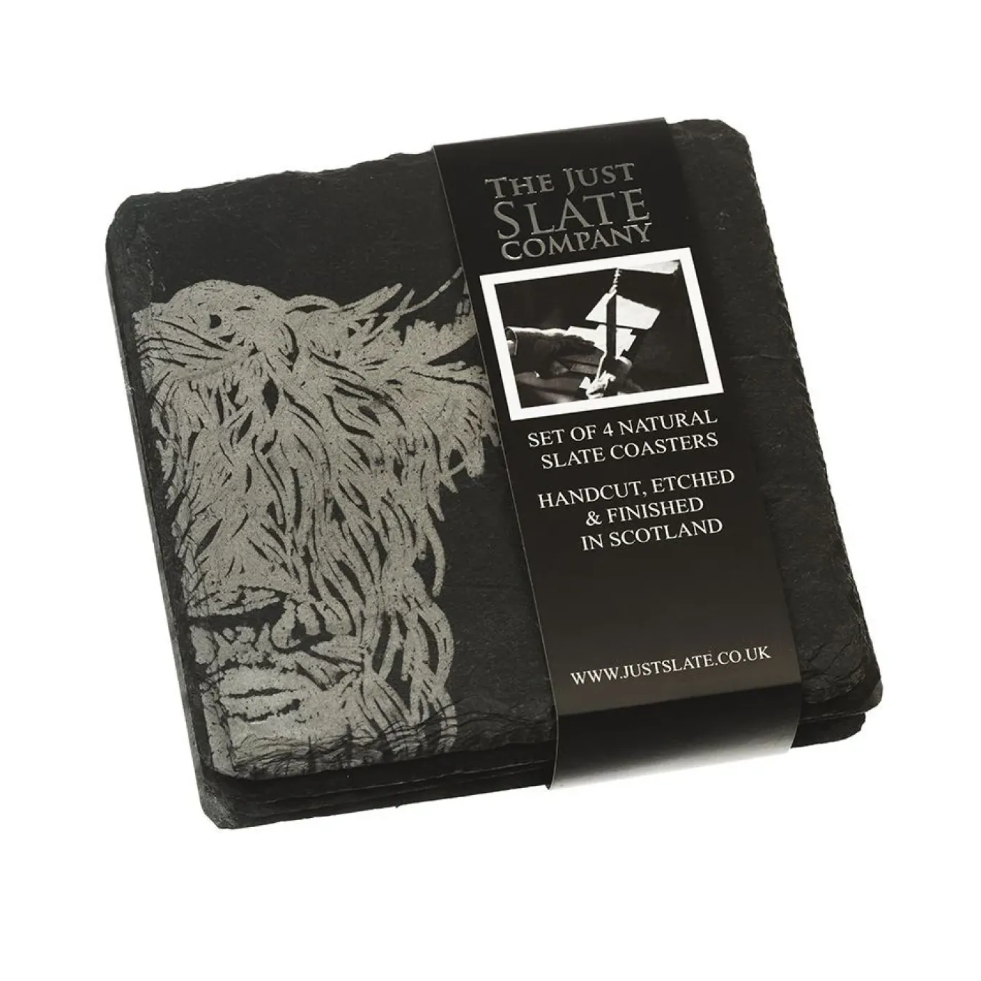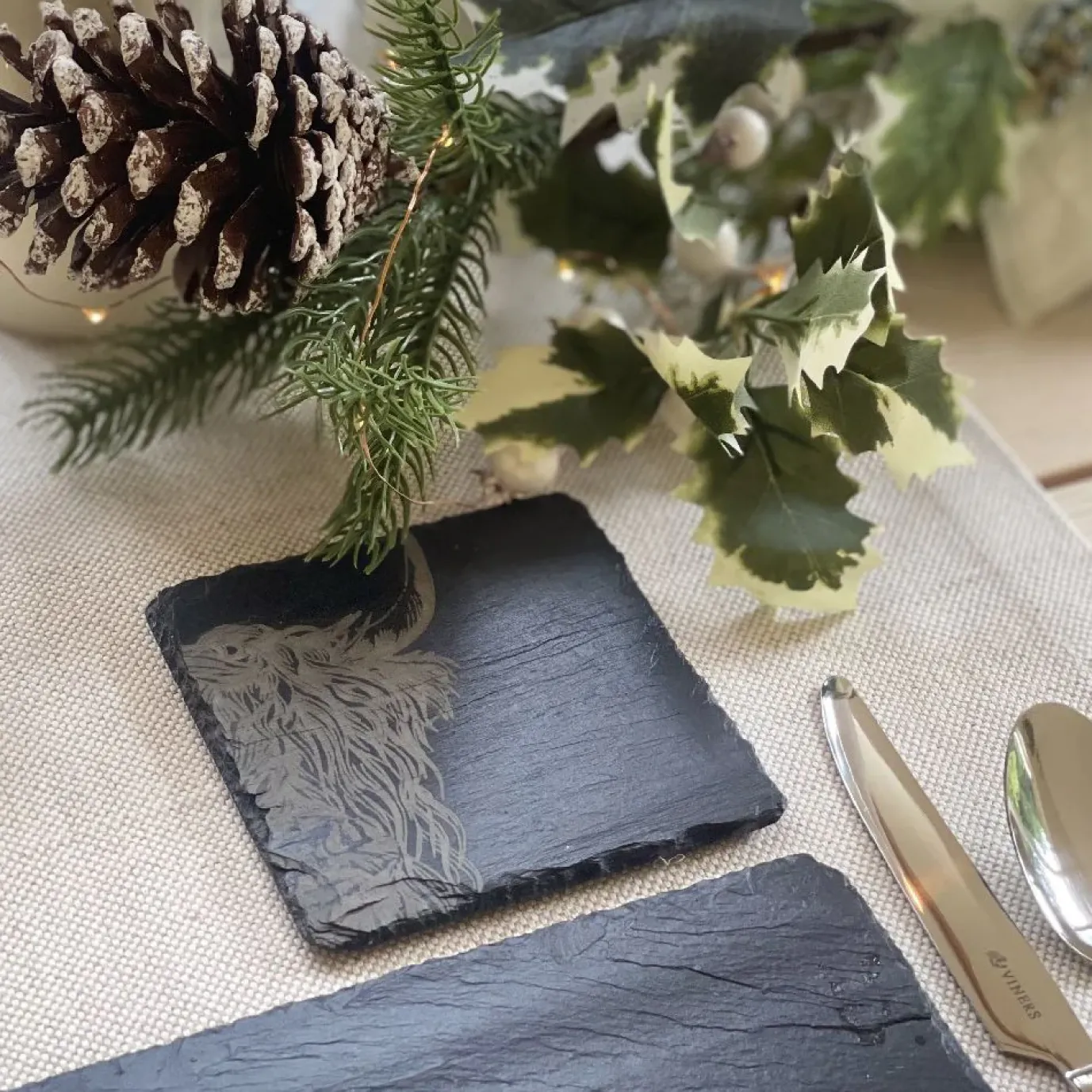 These beautiful, hand-crafted square slate coasters have been engraved with a stunning hand-illustrated drawing of a quirky highland cow. These unique and quirky slate coasters make a lovely table piece for your guests to set their drinks on.