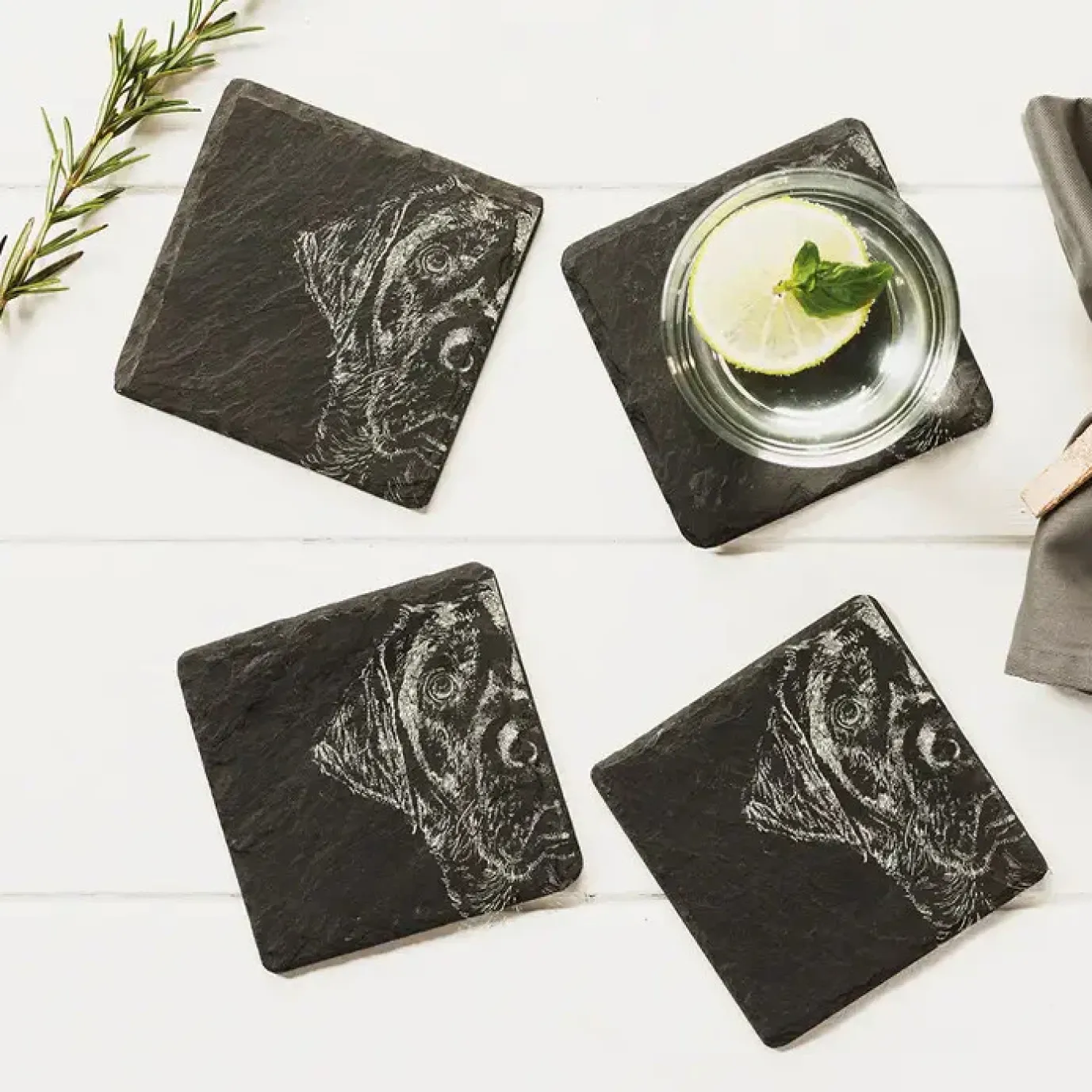 These beautiful, hand-crafted square slate coasters have been engraved with a Labrador.