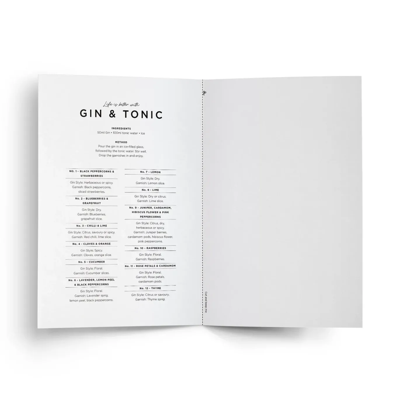 The card doubles as a cut-off gin garnish recipe guide with the ingredients and methods printed on the inside left which the recipient can use to master all 12 G&T’s. The inside right is blank for your handwritten note. The perfect keepsake for the gin lover in your life.
