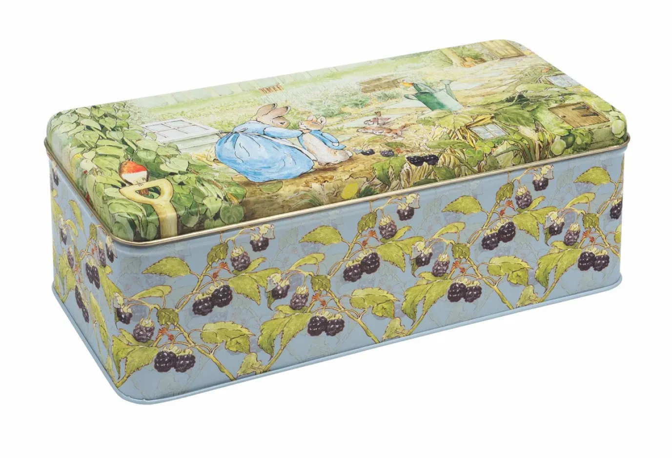 Rectangular tin with a delightful Peter Rabbit design. Perfect for crackers and cookies.