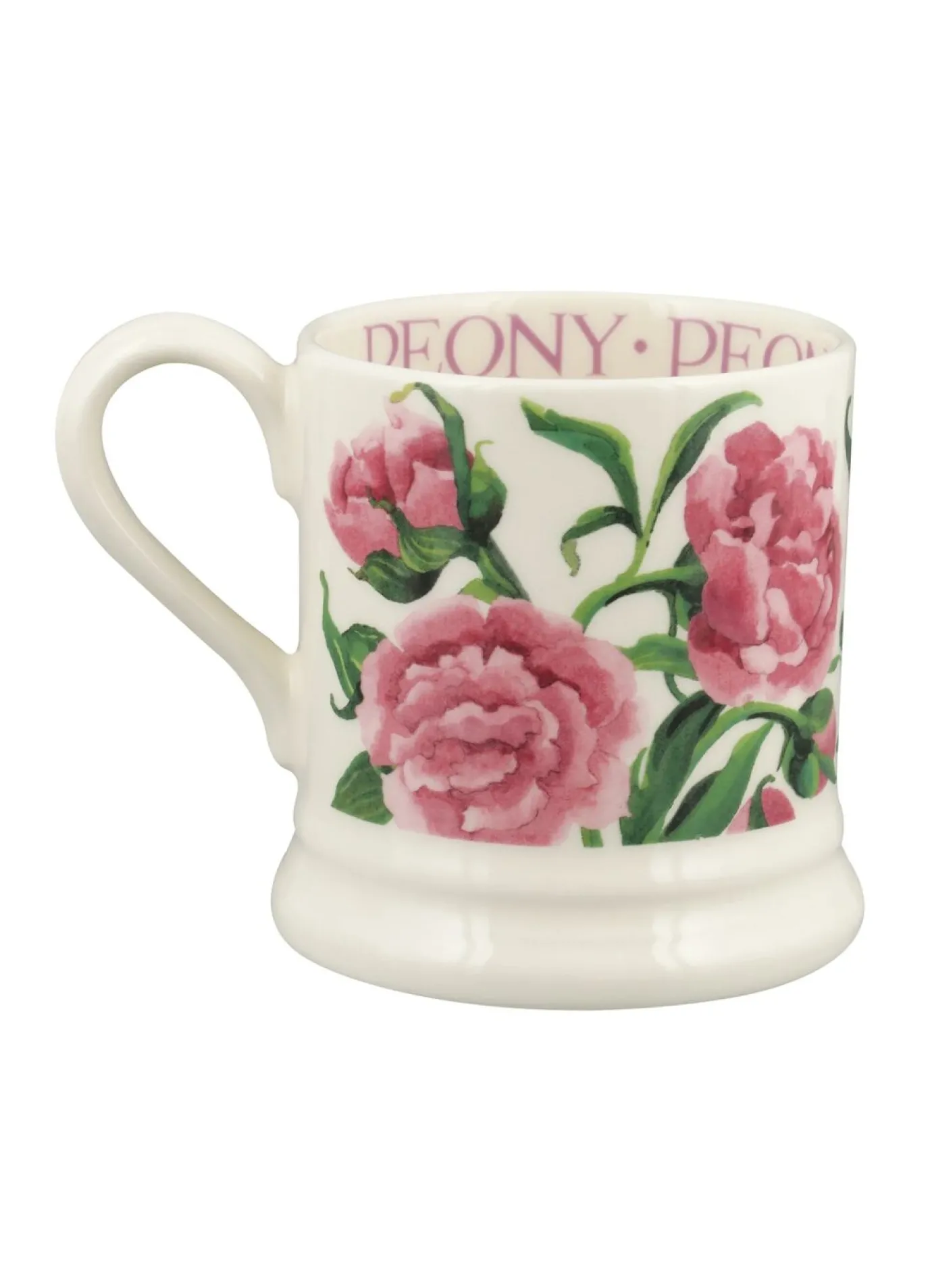 Peonies are flamboyant bouffants of fragrant gorgeousness, as shown on this Emma Bridgewater Pink Peony 1/2 Pint Mug. Handmade in England.