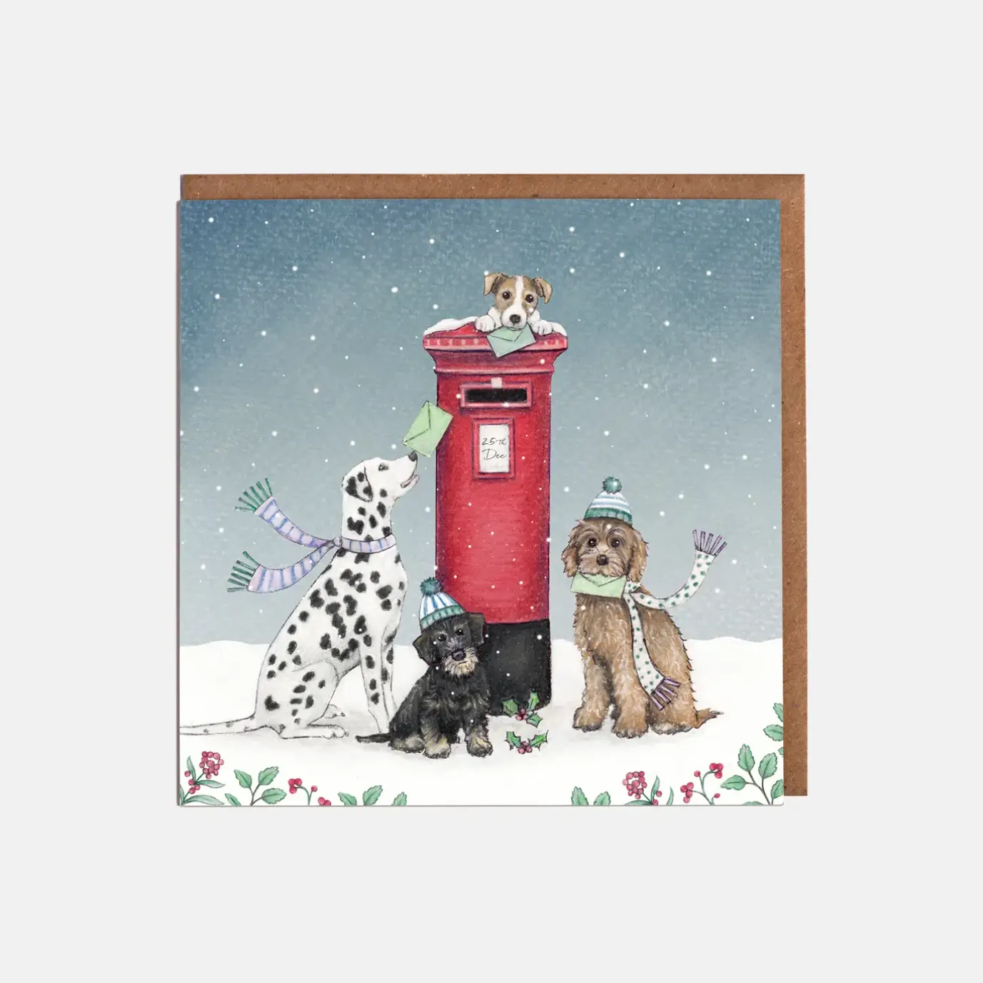 This beautifully decorated Christmas Card by Lottie Murphy features 3 cute pups waiting to post their Christmas cards.