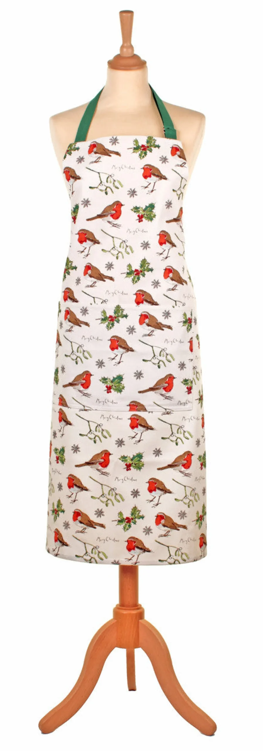 This fun festive Robins and Holly apron is designed by the popular artist Madeleine Floyd. Produced from 100% cotton, this stylish apron features beautiful robins and decorative holly onto a soft background and festive green adjustable neck strap and waist tie. Other kitchen textiles are also available making this the perfect collection for Christmas time.