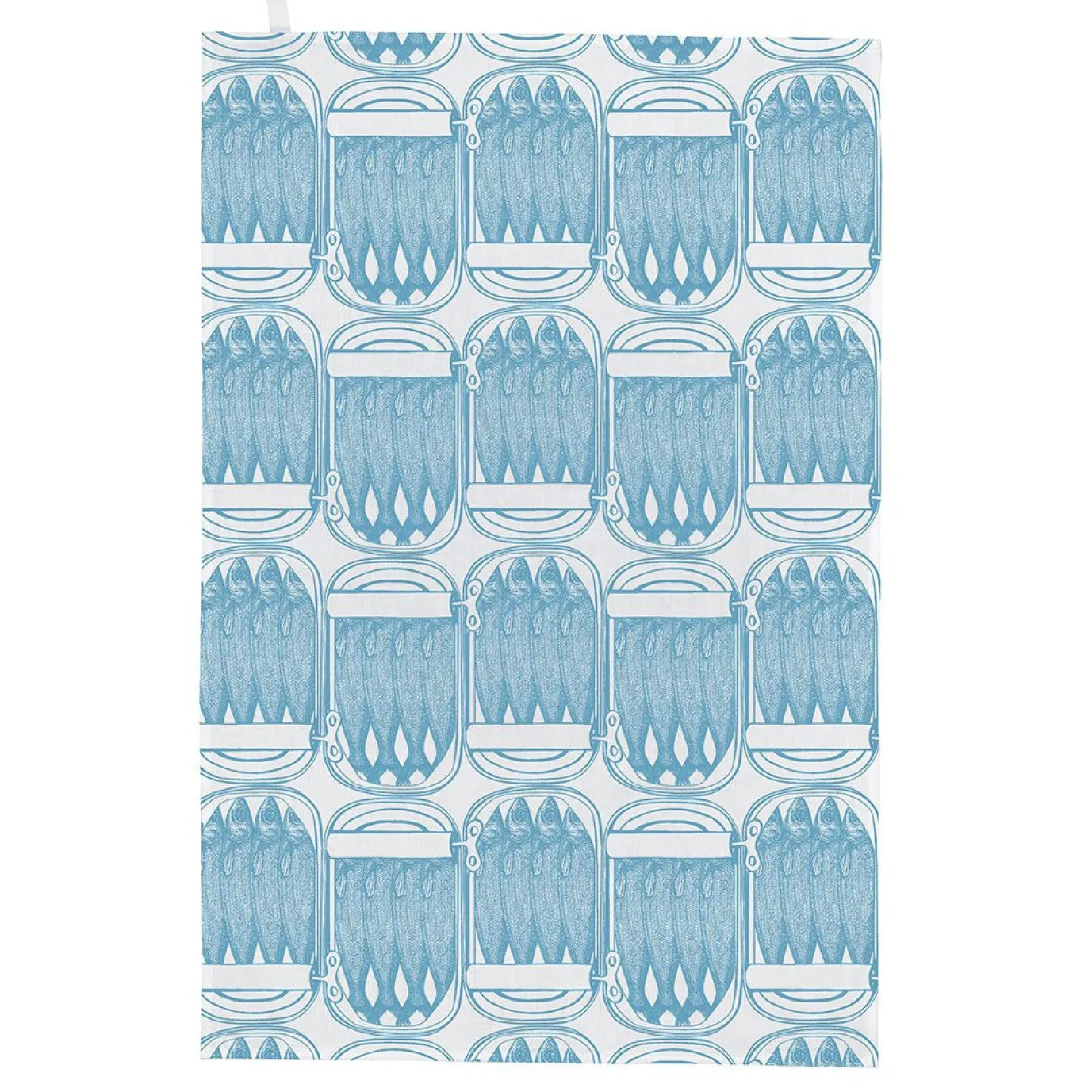 100% white cotton tea towel printed with the breezy blue Sardine print