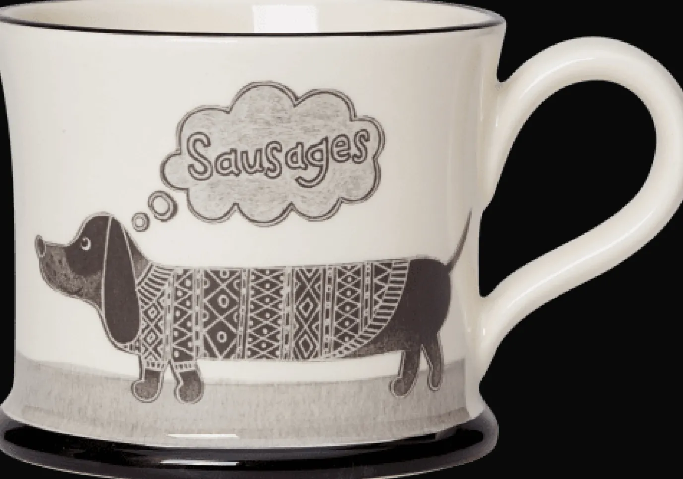 This is a beautifully simple stoneware mug by Moorland Pottery. This 12oz. mug features a sausage dog in a sweater.