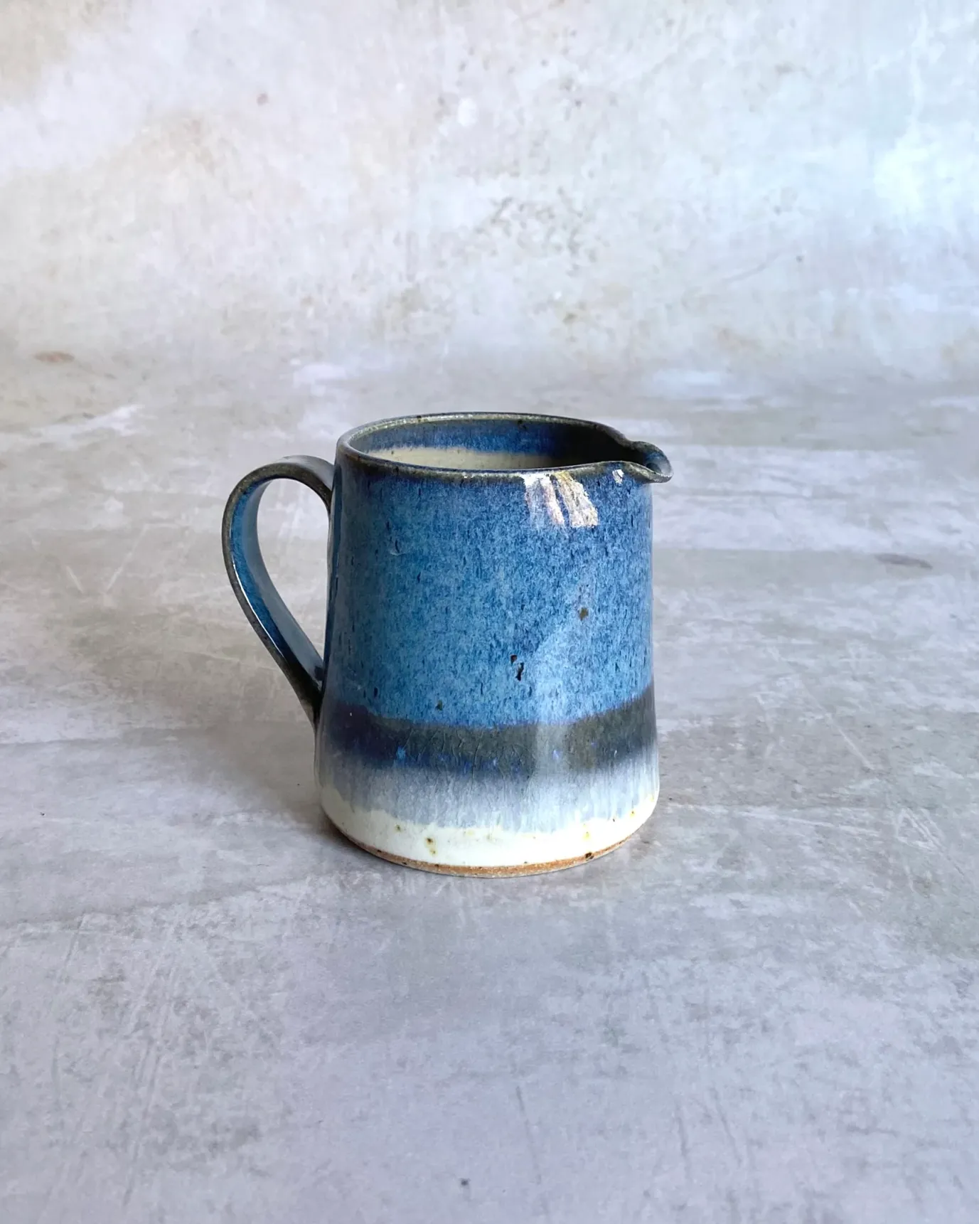 A handmade milk jug from Emily Doran Pottery, thrown on the pottery wheel and glazed in a combination of shiny blue and matt oatmeal, overlapping in the middle to create a reactive stripe. It has a slightly tapered shape and can be used as a small jug or a little vase with a posy of flowers.