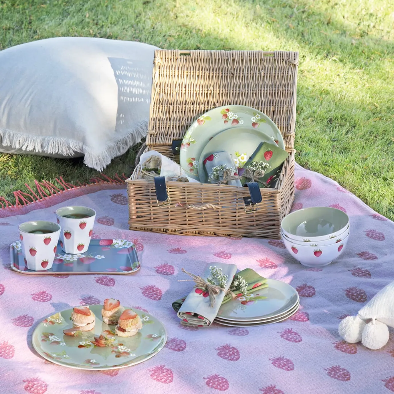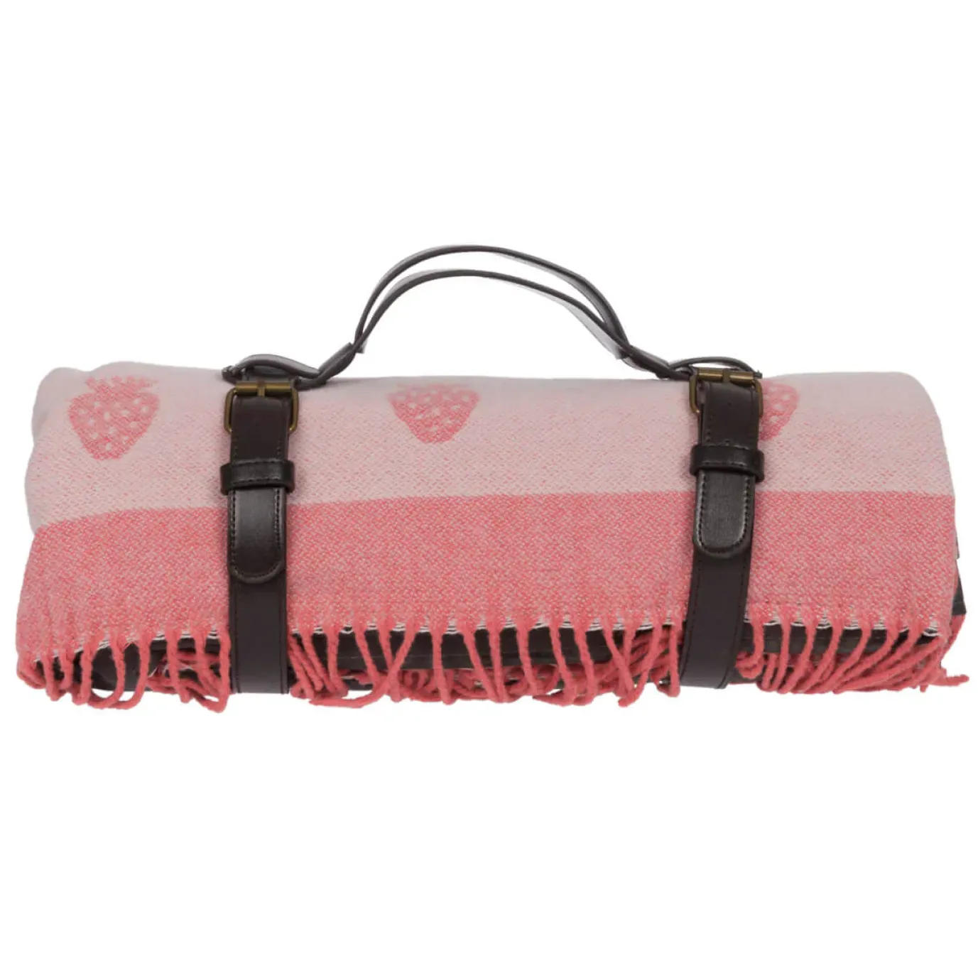 Make picnic and beach trip memories sweeter with this practical and stylish picnic blanket from our Strawberries collection. Featuring Sophie’s strawberries silhouettes on a blush pink ground colour, it is perfect for family days out or taking a snooze in the sun. The faux leather straps make it easy to carry around, whilst the water-resistant backing is perfect for keeping you dry if the ground is wet.Â