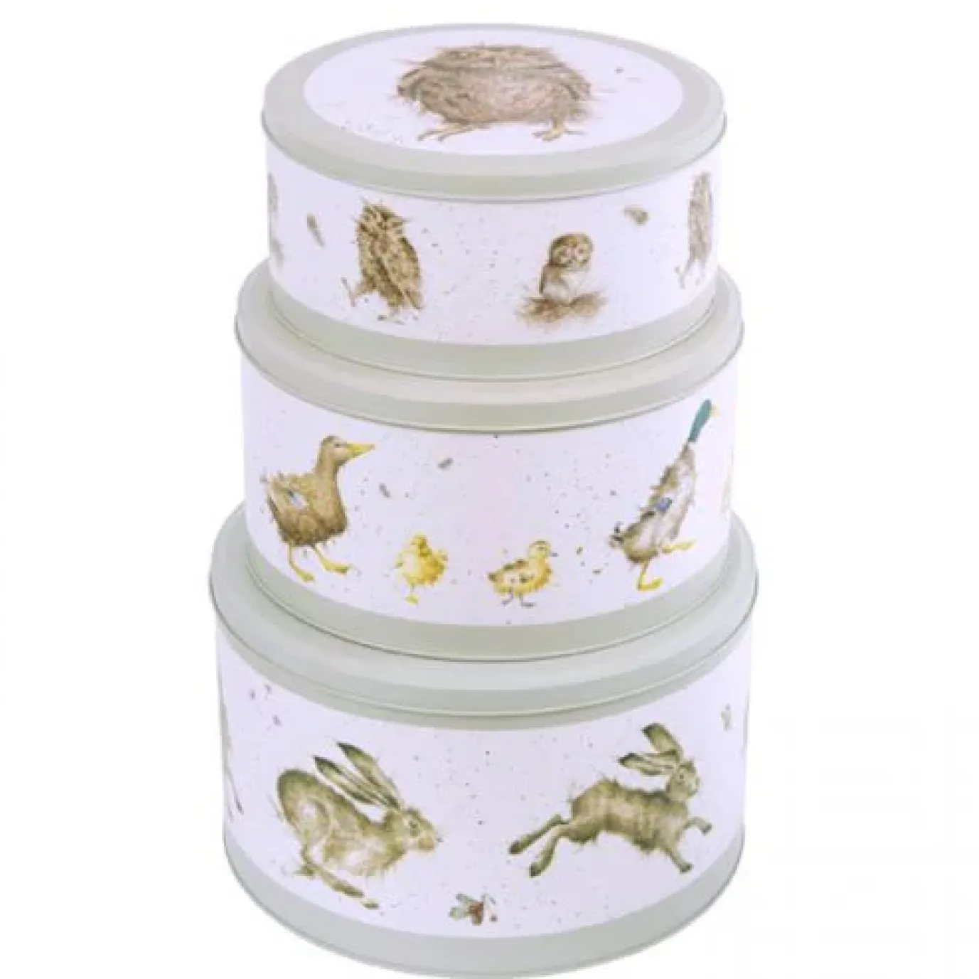 Large tin (Hare) measures 9.84 inches in diameter. Medium tin (Duck) measures 8.85 inches in diameter. Small tin (Owl) measures 7.67 inches in diameter