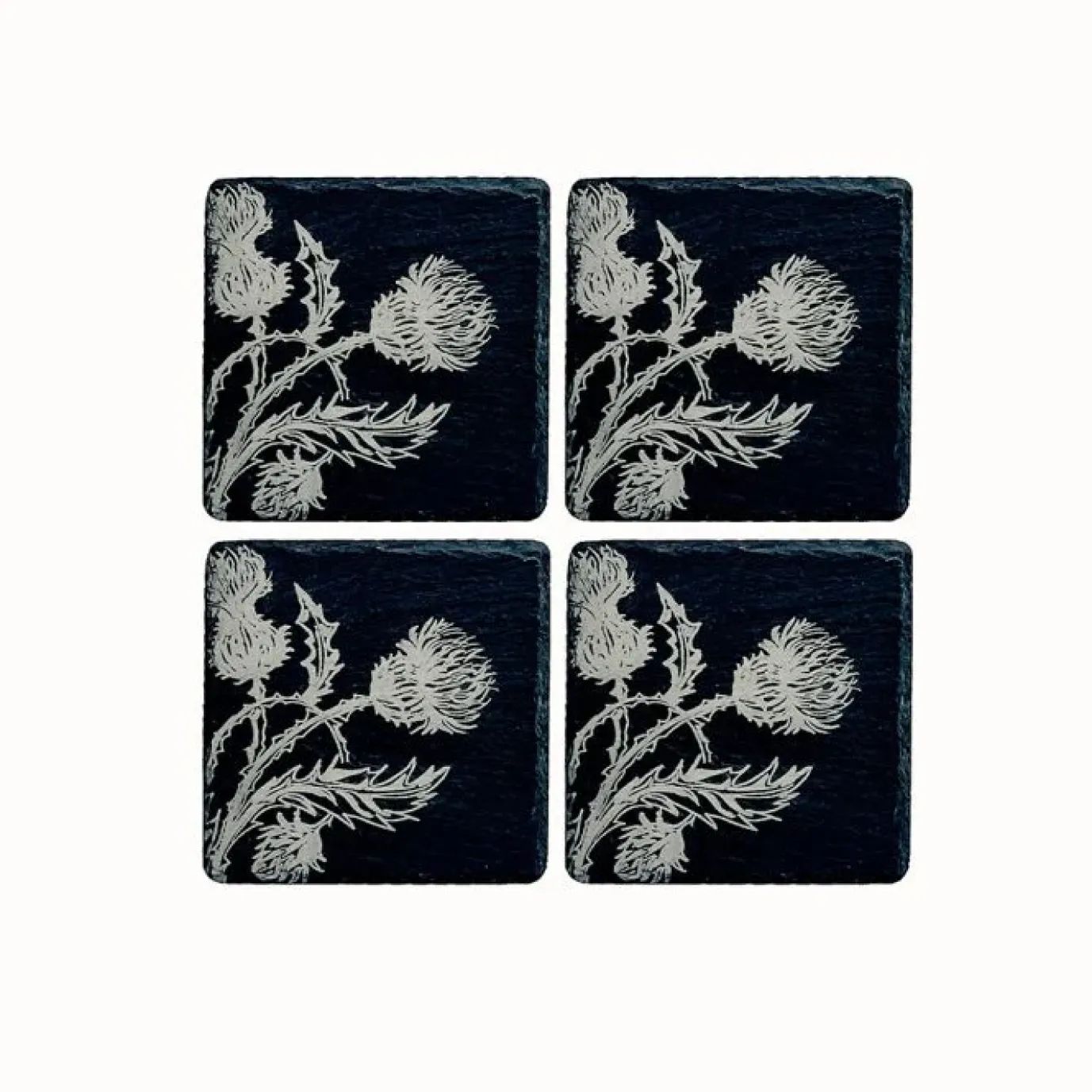 These beautiful, hand-crafted square slate coasters have been engraved with a trio of Scottish thistles.