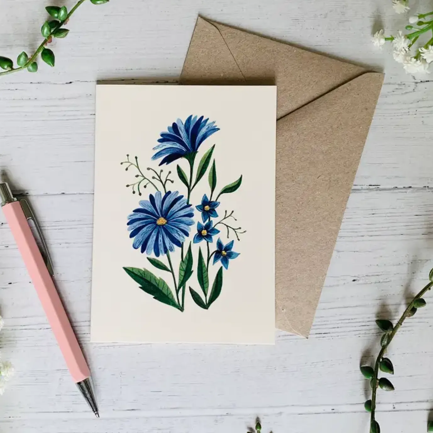 This A6 greeting card features a vibrant blue wildflower design, a reproduction of an original watercolour painting. Perfect for any occasion!