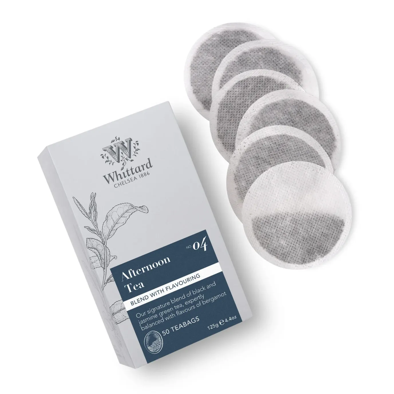Whittard signature Afternoon Tea traditional teabags. An elegant blend of black tea and jasmine-scented green tea, with flavors of bergamot.