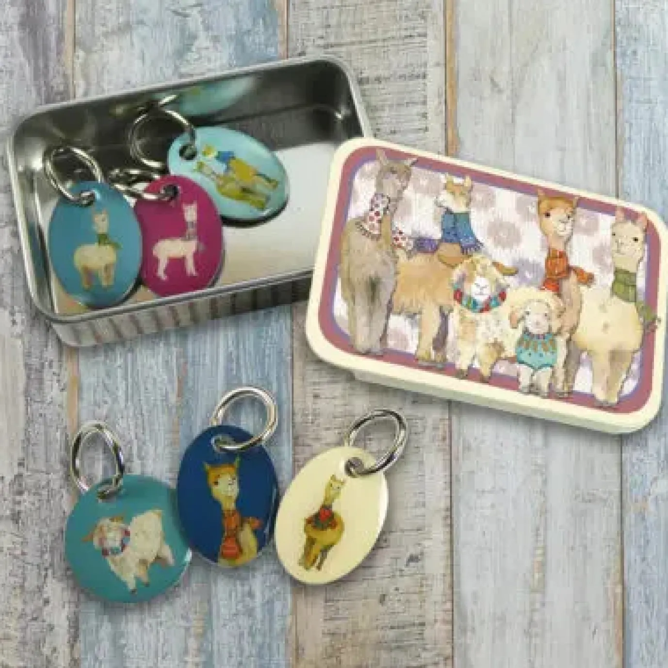 These stitch markers are 0.75 inch round and feature six designs from Emma’s Alpaca and Friends collection in a matching pocket tin.