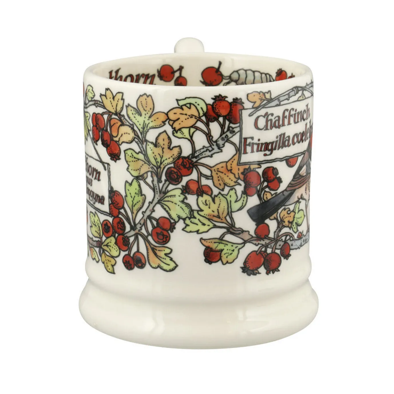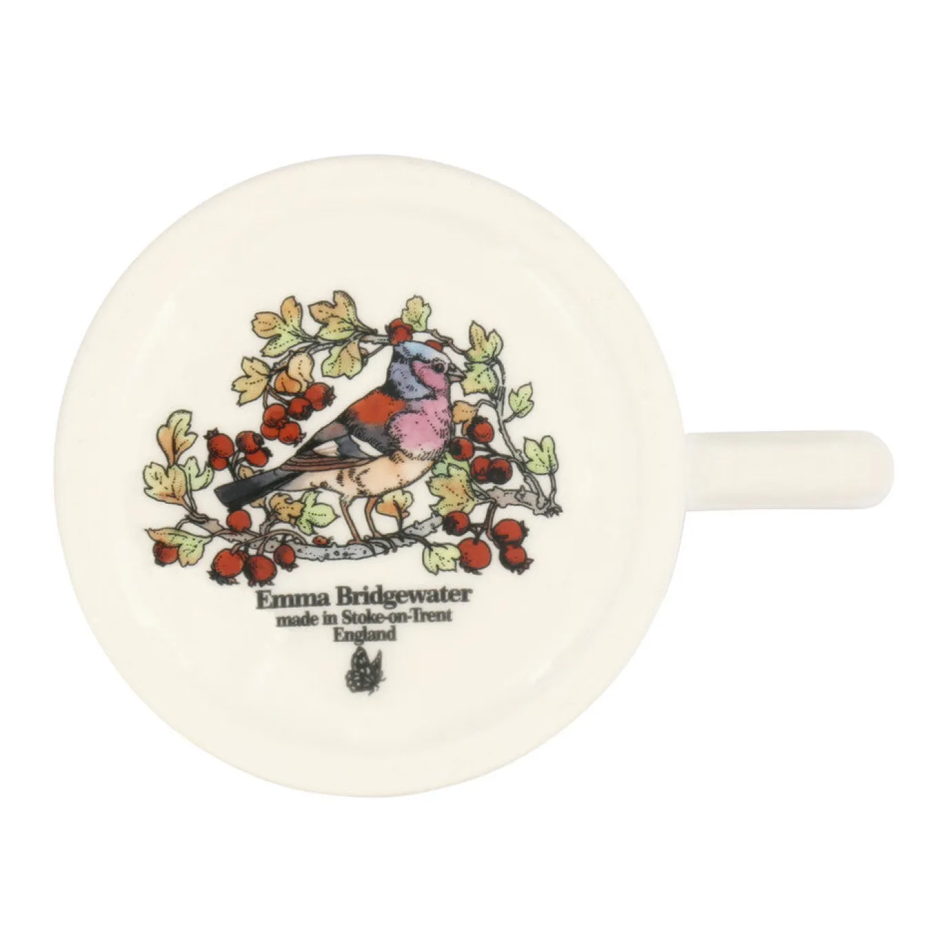 A colorful Chaffinch perched on a Hawthorn branch illustrates this 1/2 pint mug, handmade by Emma Bridgewater.