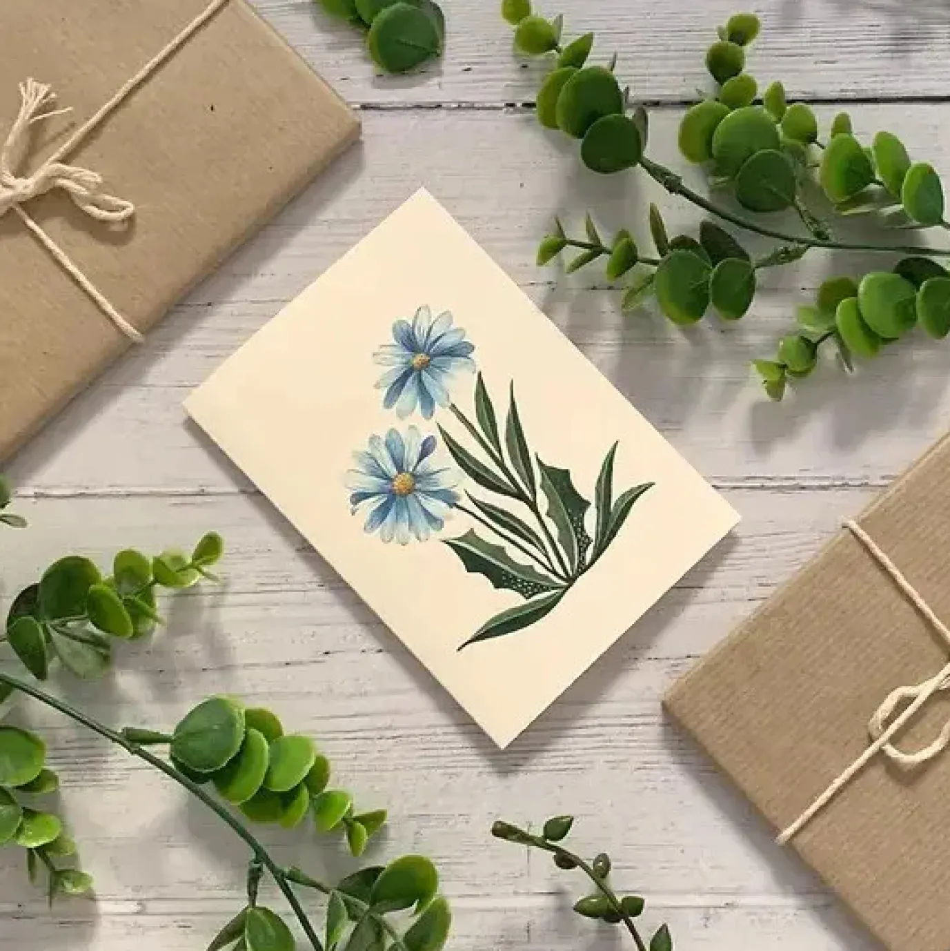 This A6 blank greetings card features a pretty blue daisies. Left blank for your own message, its perfect for any occasion! Luxurious textured 280gsm Acquerello paper