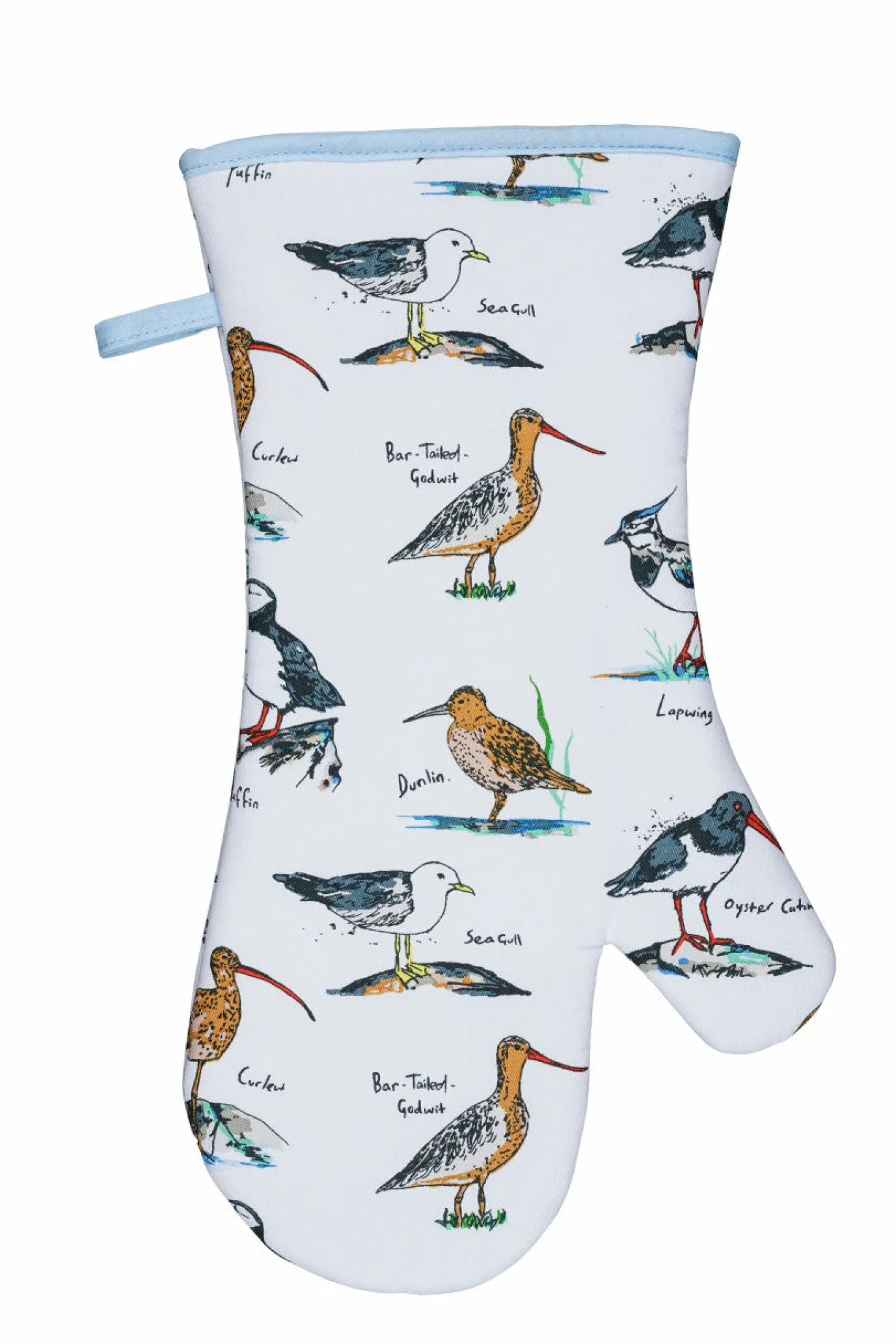High quality Coastal Birds gauntlet featuring the Puffin, Sea Gull, Oyster Catcher, Lapwing, Bar-Tailed Godwit, Dunlin and Curlew. These striking birds stand out on a white background with a pale blue trim and hanging loop. Made from 100% cotton and special heat resistant polyester wadding filling that meets British Standard. This single oven glove gauntlet will protect you from oven heat as you take your cooking from the oven to the table. Machine washable.