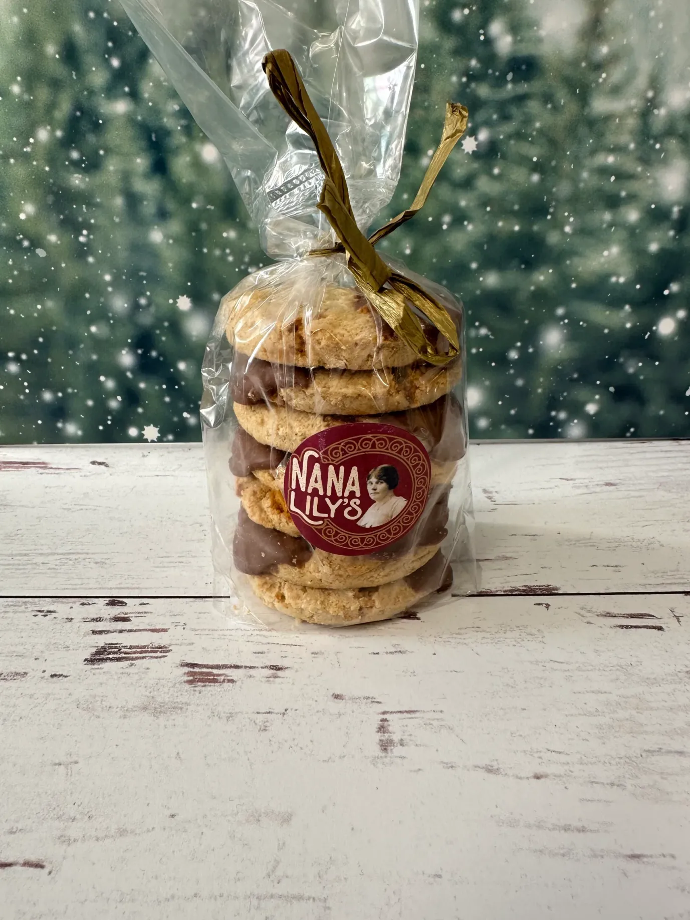 A delicious Oatie biscuit made with honeycomb pieces accompanied with milk chocolate dipped on one half of the biscuit.