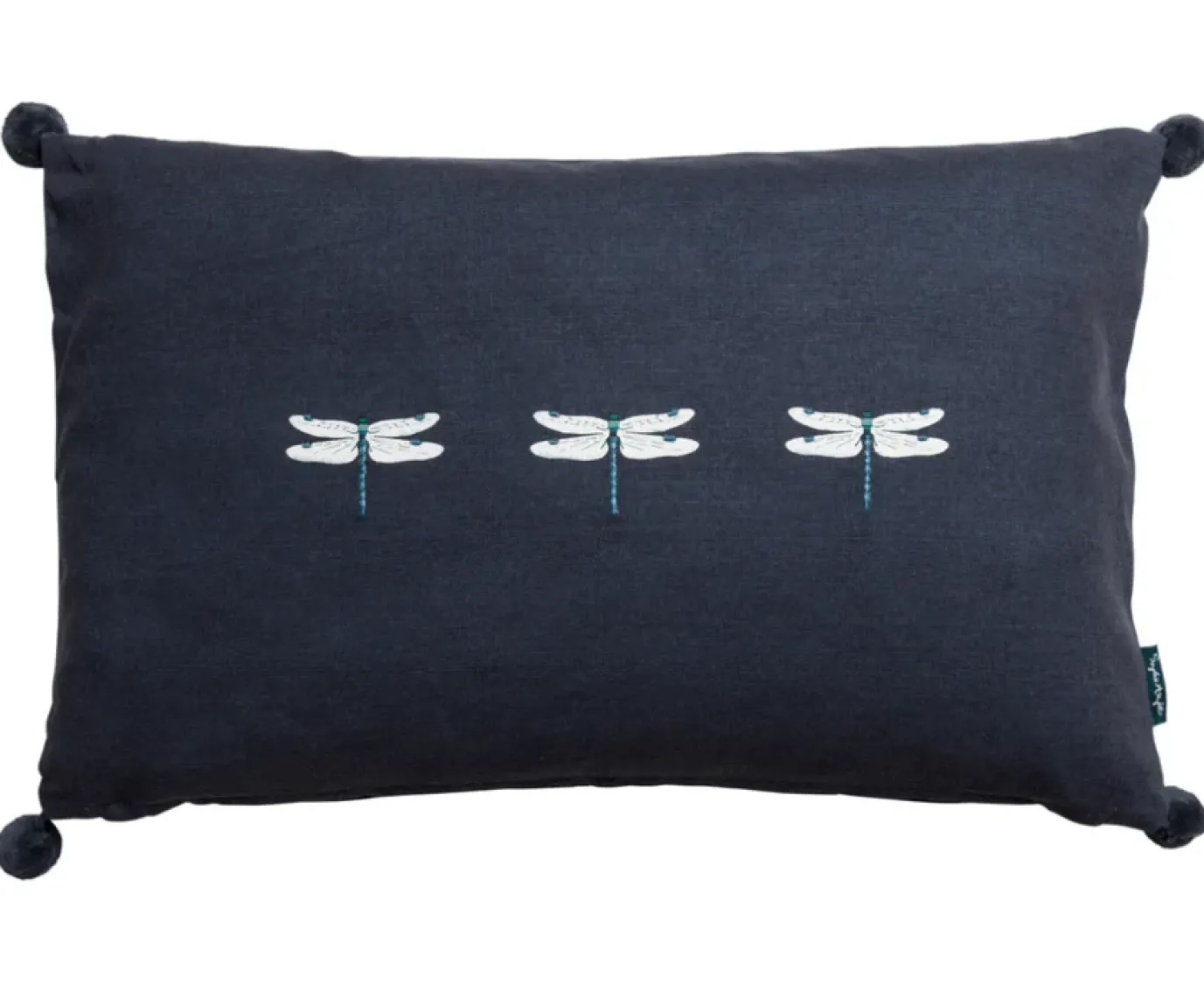 Three striking embroidered dragonflies sit centrally against the contrasting midnight blue background, on this stylish decorative cushion. It’ll look lovely in a lounge or bedroom and is finished with small pompom corner detailing.
