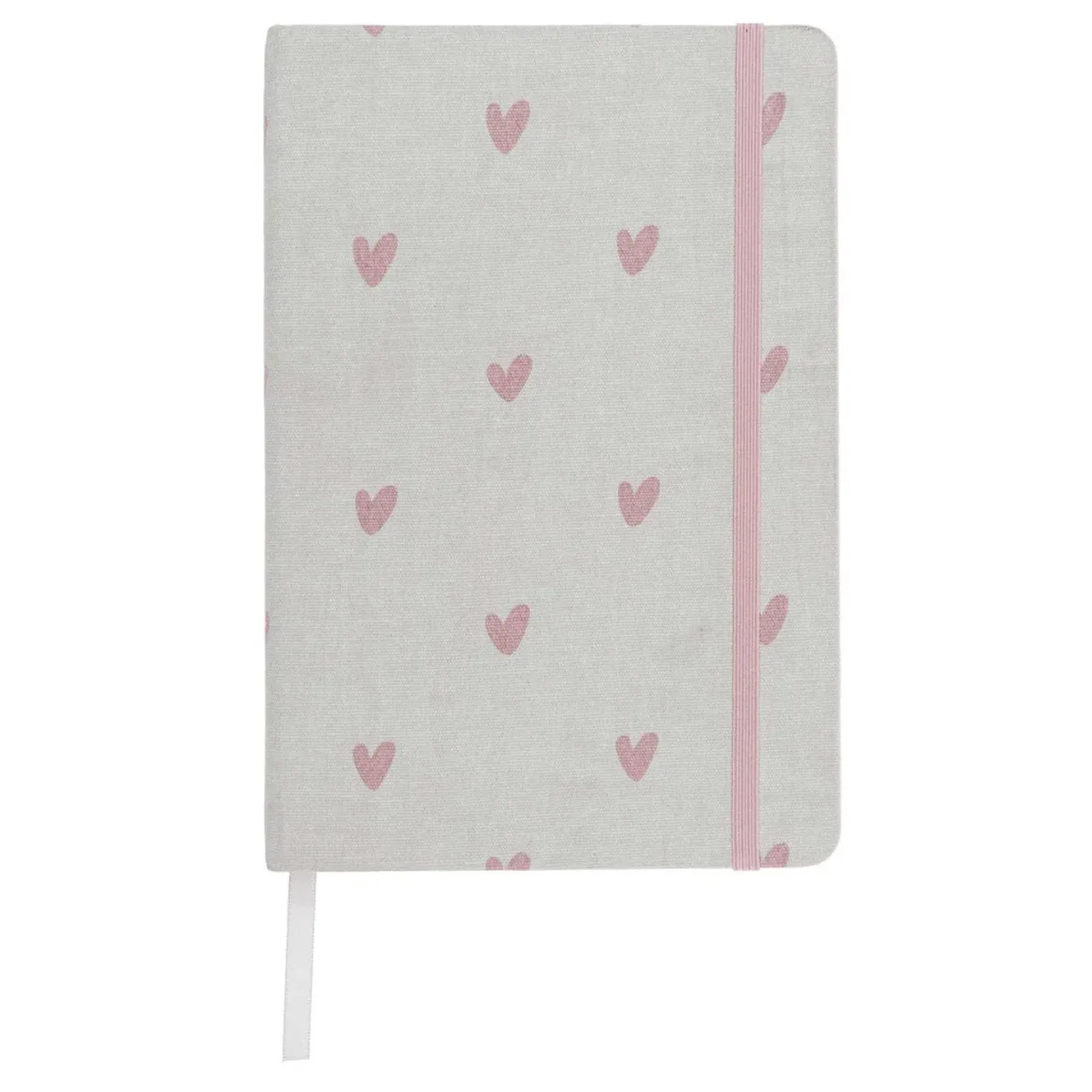 This stylish A5 Notebook is covered in our hearts cotton fabric. It has 160 pages (80 sheets) of crisp, ruled ivory paper and a practical ribbon page marker with elastic closure.