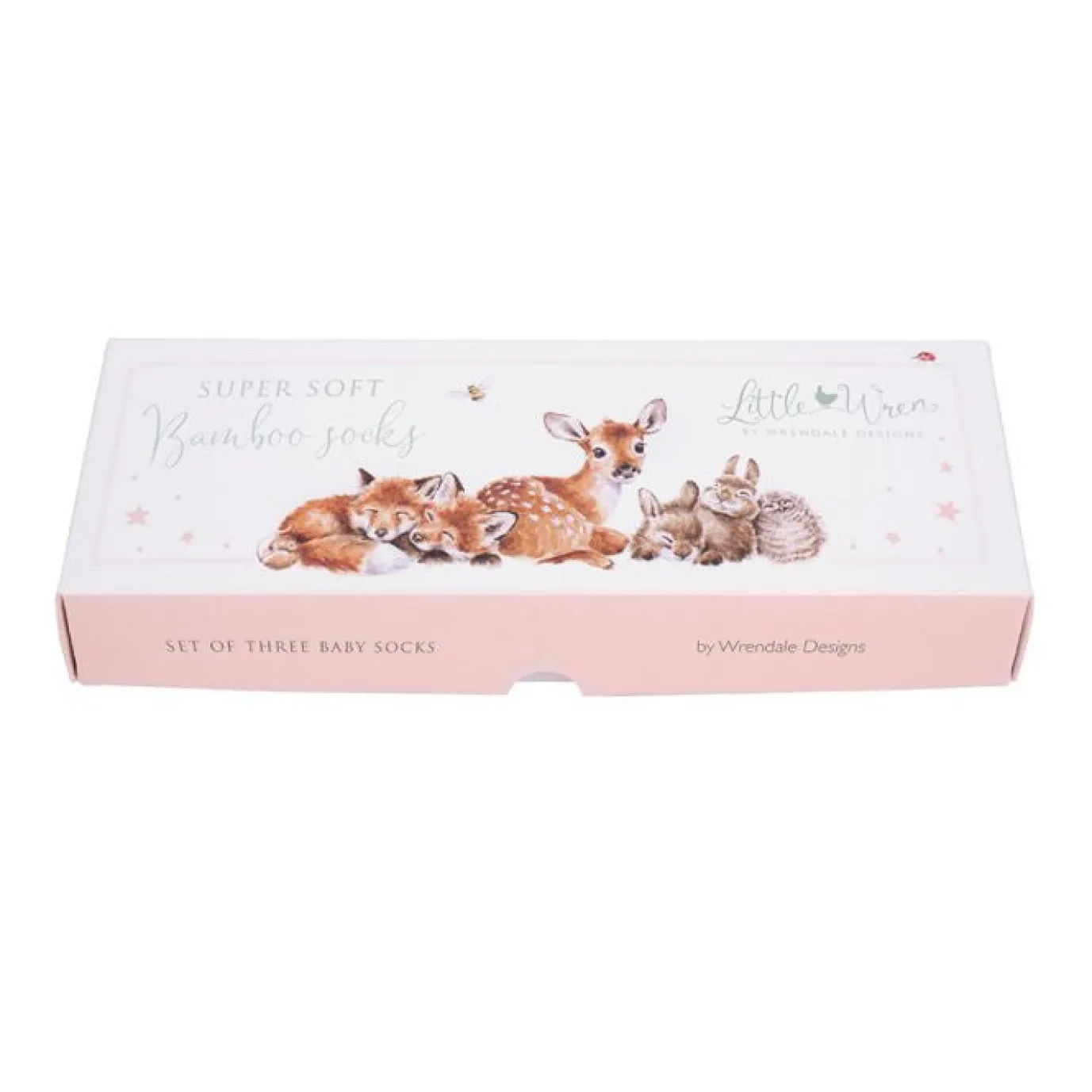Keep tiny toes cosy with these beautifully soft bamboo baby socks from Wrendale Designs. With colored tops, heels and toes, each set features two animal designs and one pattern on a striped background all with Little Wren branding knitted into the base of the foot. Presented as a set of three in a beautifully illustrated gift box, these are a perfect gift for a new arrival.