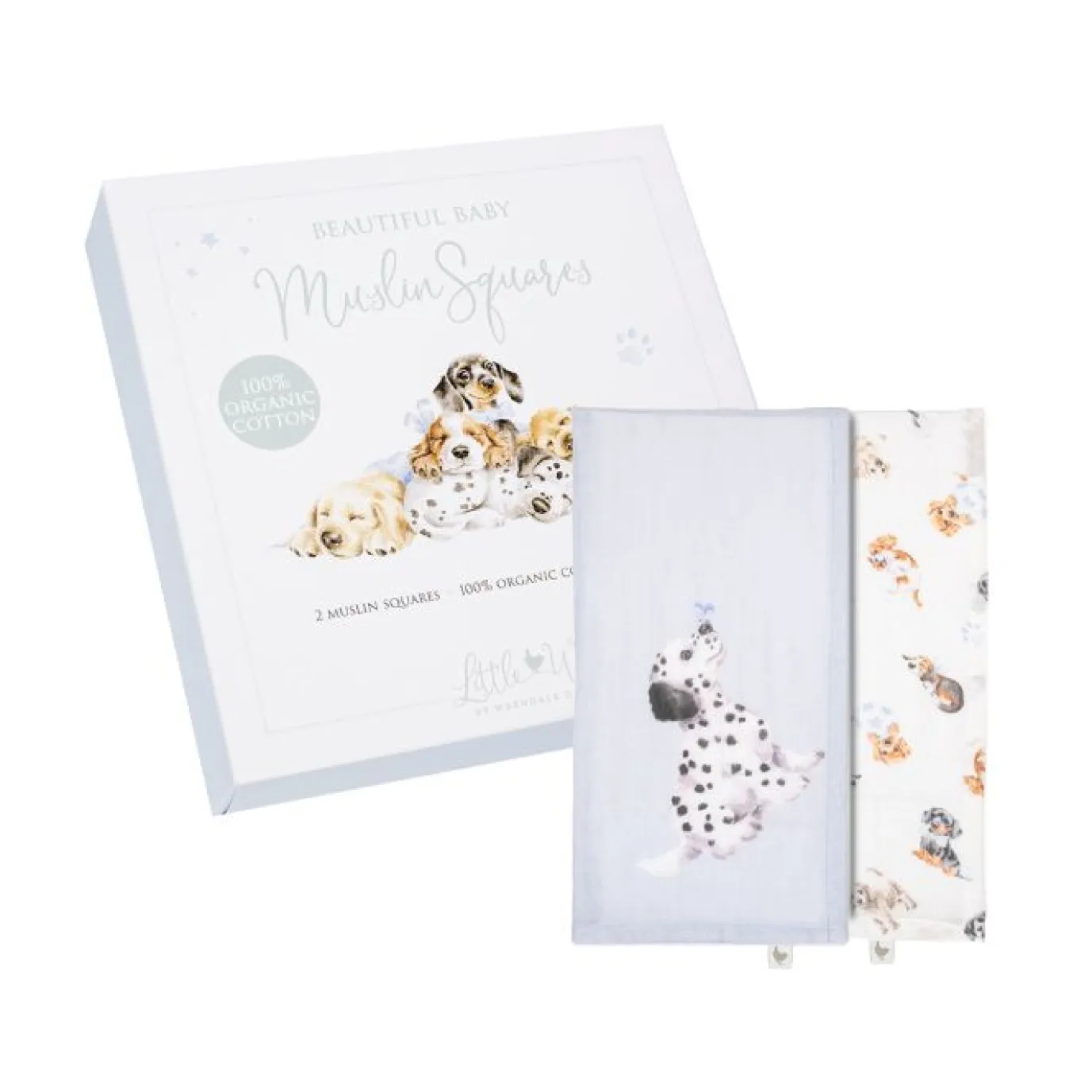 Made from 100% organic cotton, this beautiful ‘Little Paws’ muslin cloth gift set by Wrendale is perfect for a variety of uses and makes a great gift. This set includes two cloths, one patterned and one with larger designs in the corners on a light blue colored background. Packaged in a beautiful gift box. Cloths measure 28 x 28 inches, sizes may vary slightly due to nature of product.