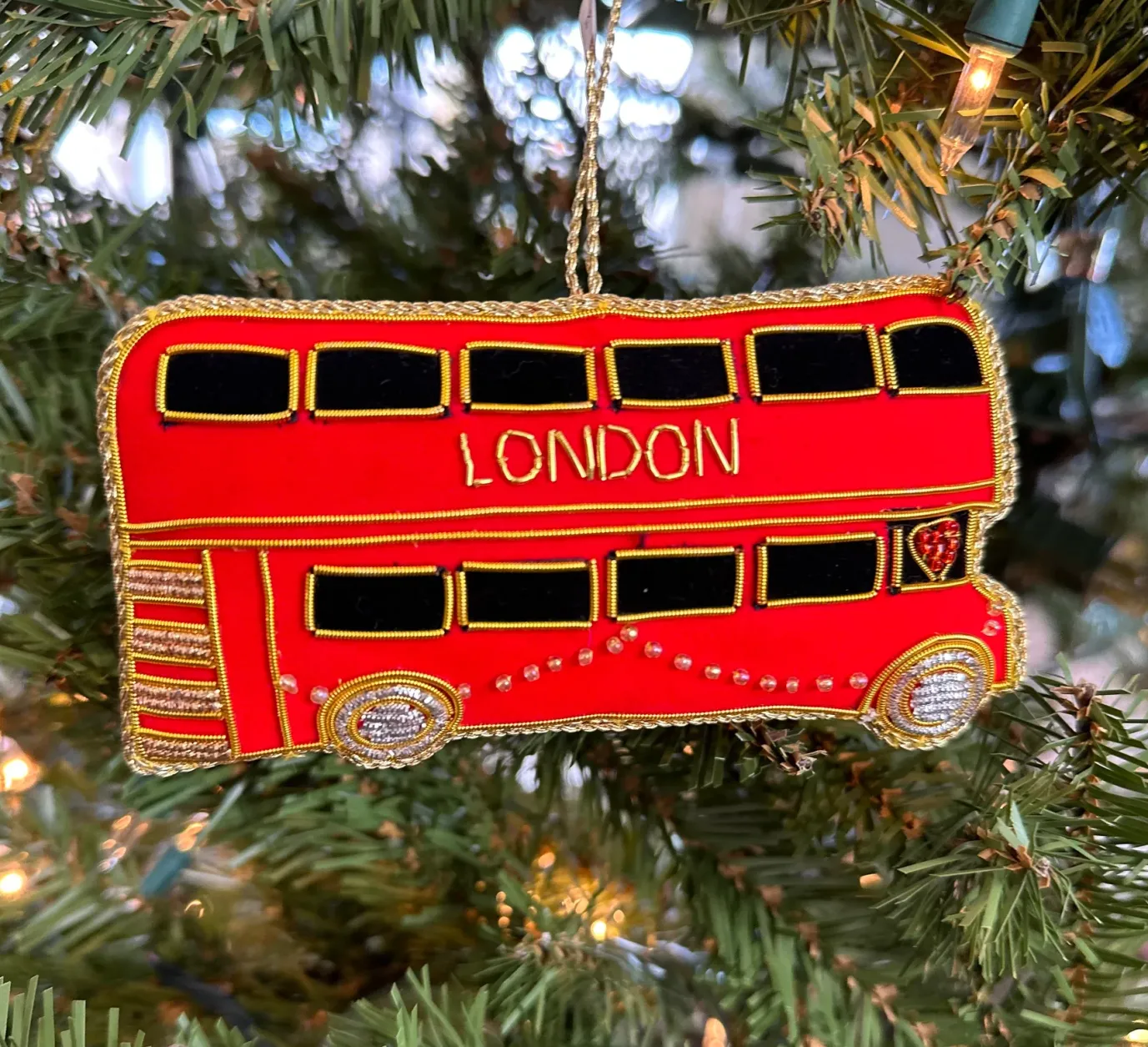Tinker Tailor’s whimsical London Bus (side view) design features traditional bullion goldwork woven with stunning crystal gems and beadwork on beautiful custom sourced fabrics to add sparkle and light to each room in your home. Perfect for tree dressing & table decorations or as a going home gift for your visitors.