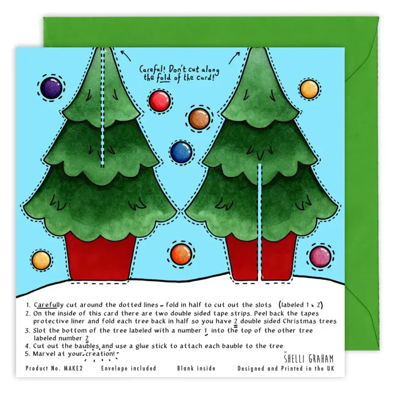 Get crafty this christmas and send a card that can be transformed into a beautiful desktop decoration. This ‘make your own christmas tree’ christmas card will give your lucky recipient the rare opportunity build and decorate a christmas tree that will not drop needles all over the floor, it doesn’t need watering either! All they need is a pair of scissors. Two strips of self adhesive tape is included inside the card. Make your own christmas tree christmas cards are printed onto high quality trucard, a specialist greetings card material that is glossy coated and scratch-proof on the outside, and uncoated on the inside so it’s easy to write on. 300gsm card is used for high-quality greetings cards that last. The card is blank inside for your own message and comes with a green paper envelope. Card measures 148mm x 148mm and is suitable for letter post.
