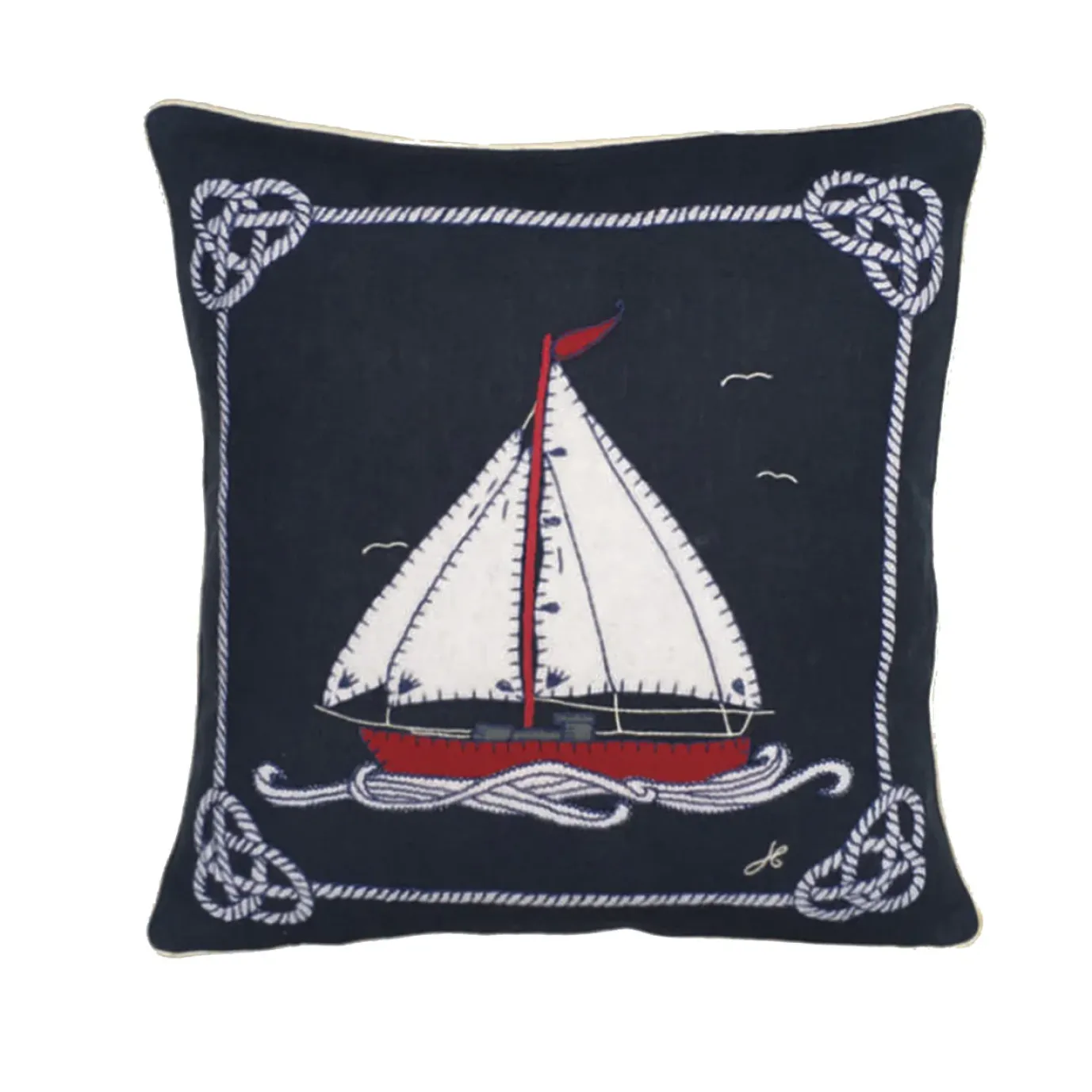 This striking nautical cushion features a beautiful sailing boat, appliquéd in cream and red wool onto a luxury navy linen base. It is hand-embroidered with blanket stitch and finished on the edges with a contrast cream piping. It will make a delightful gift or purchase for anyone who loves boats or lives beside the water.