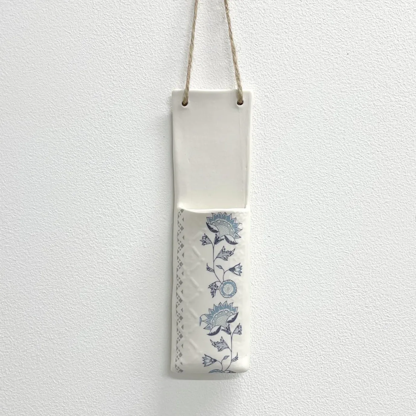 Handmade Porcelain Hanging Planter Pocket with embossed textures and transfer prints.