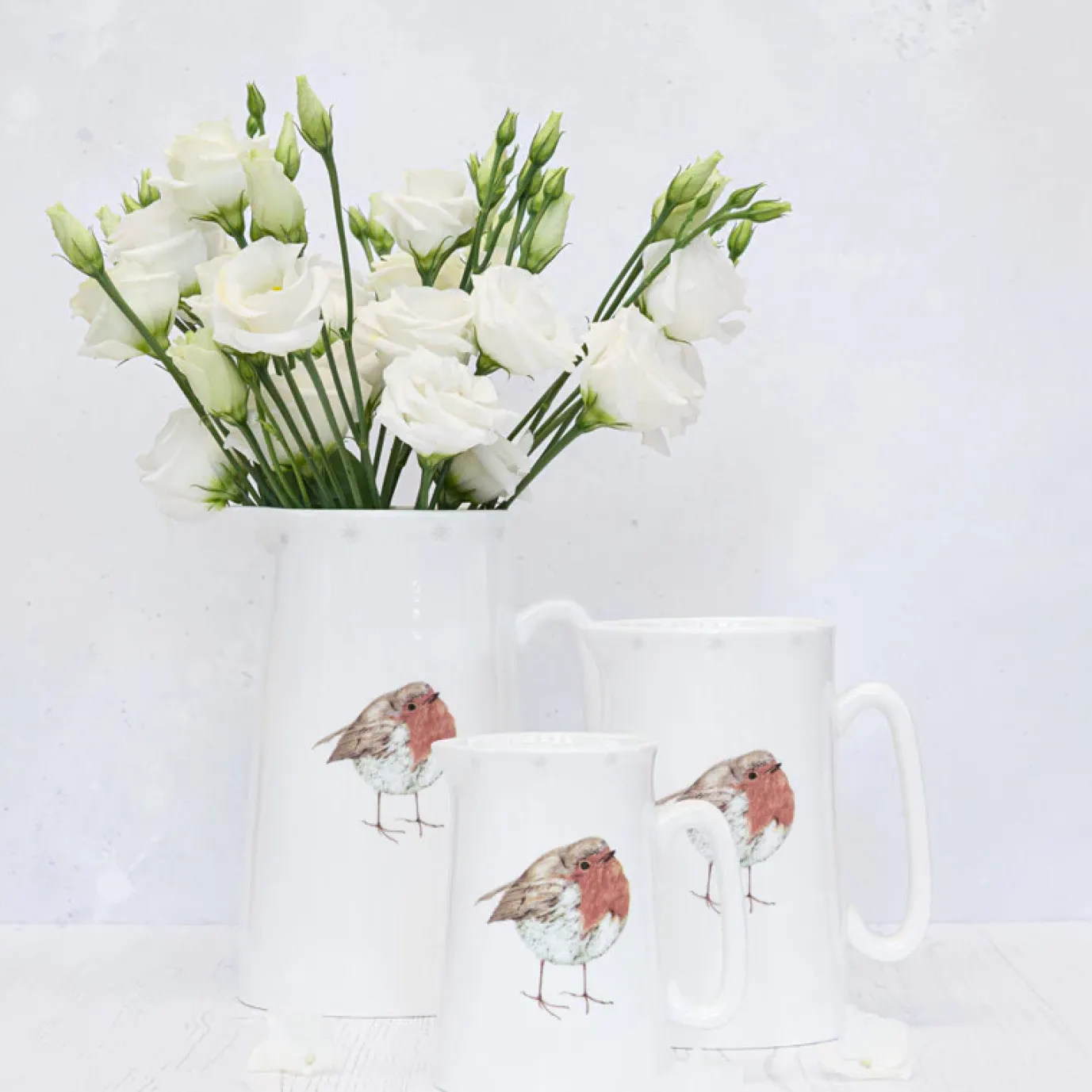 This fine bone china jug is hand decorated in Staffordshire, with a little Mosney Robin, set on a white china background with snowflakes circling the top of the jugs. This jug is a great practical or decorative addition to any kitchen. Available in mini, (7.5cm, 140ml capacity) medium (13.5cm, 500ml capacity) and small (10.5cm 300ml capacity) the set are a sight to behold.Â