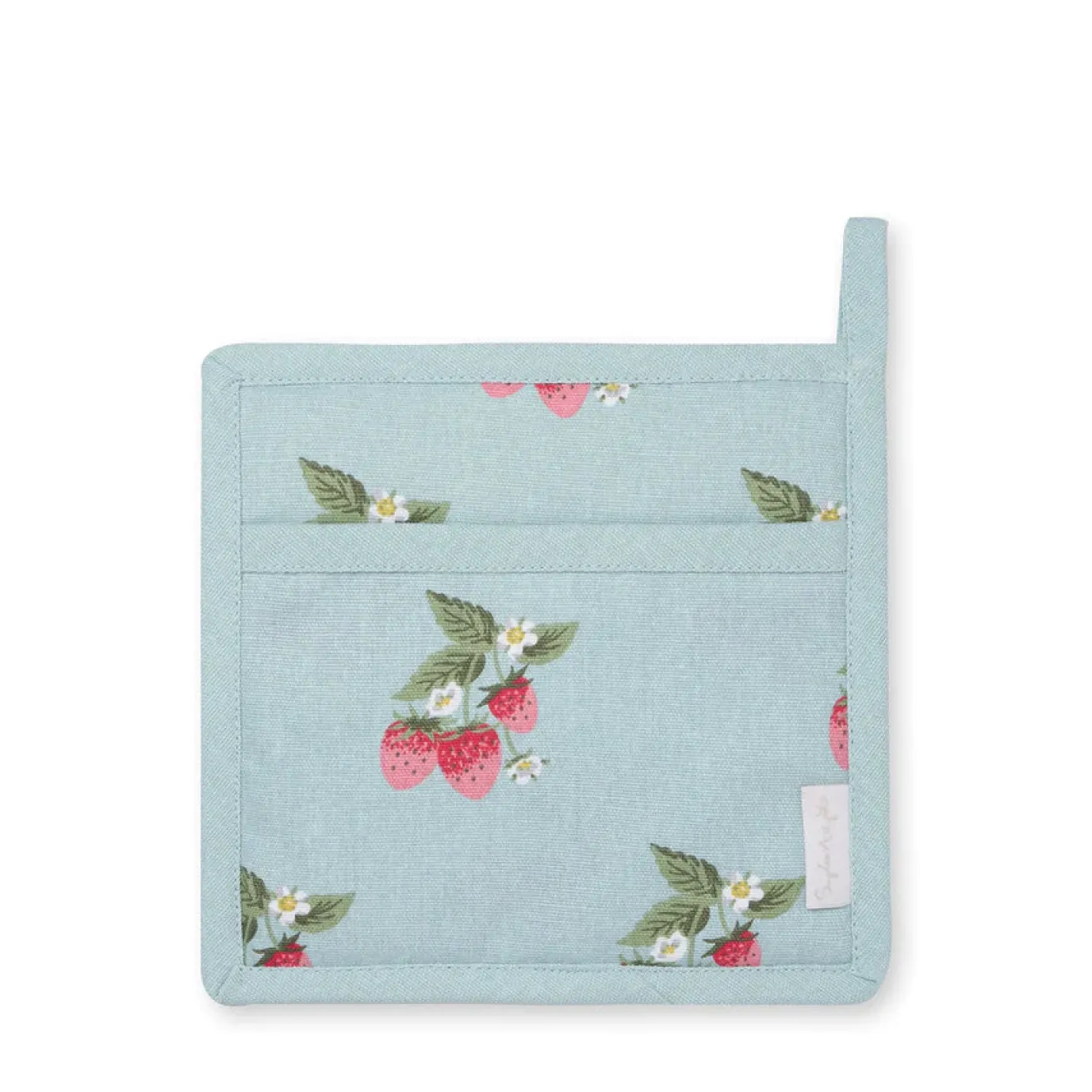 Protect your hands while lifting hot pans and dishes with this super sweet Strawberries pot grab. Made from 100% cotton it is hard-wearing and the internal padding gives you excellent insulation. Featuring Sophie’s bunches of juicy red strawberries on a blue background.