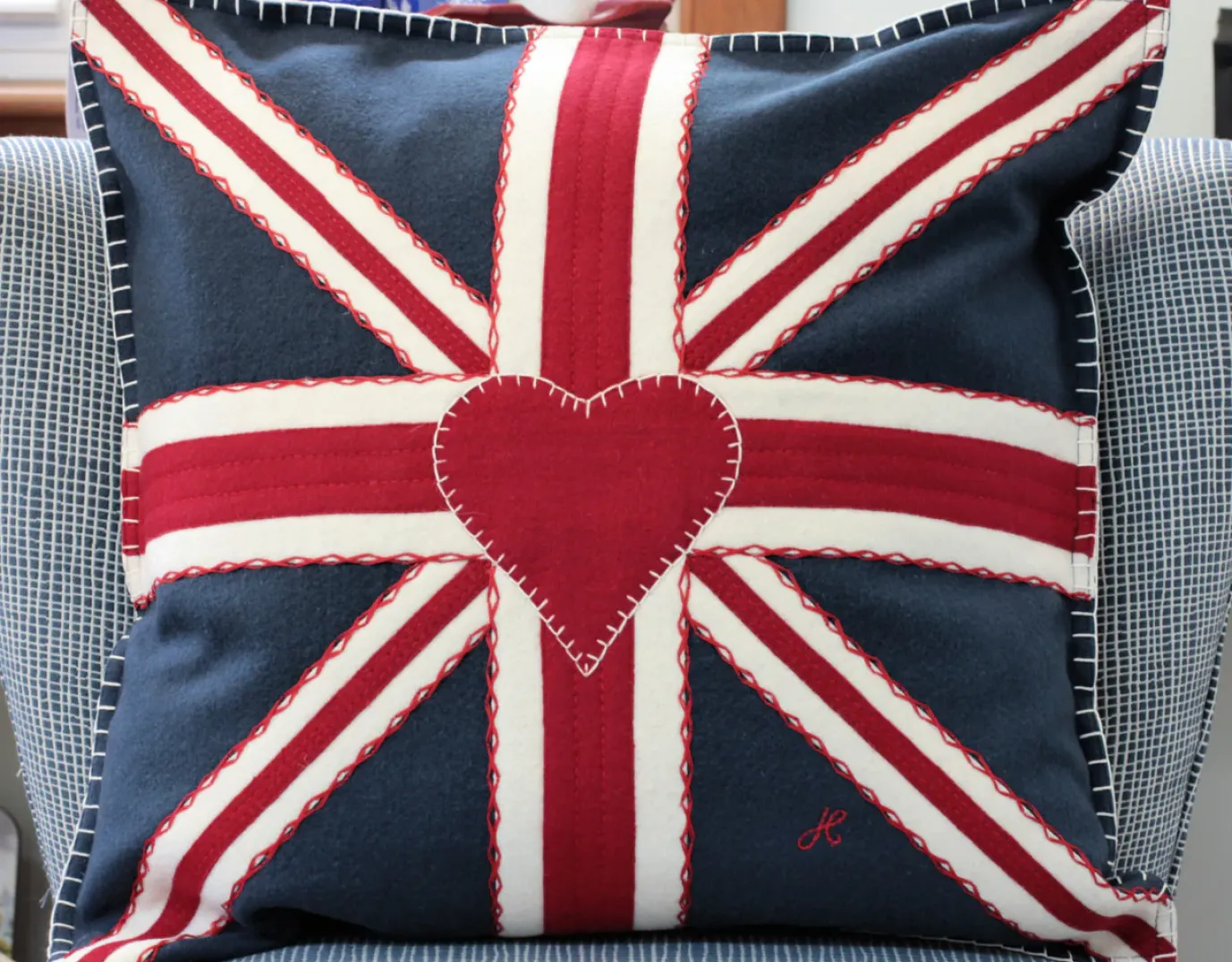 This large square navy blue hand-embroidered Jan Constantine Union Jack cushion with the Constantine heart in the center is made of pure wool and edged in cream blanket stitch.