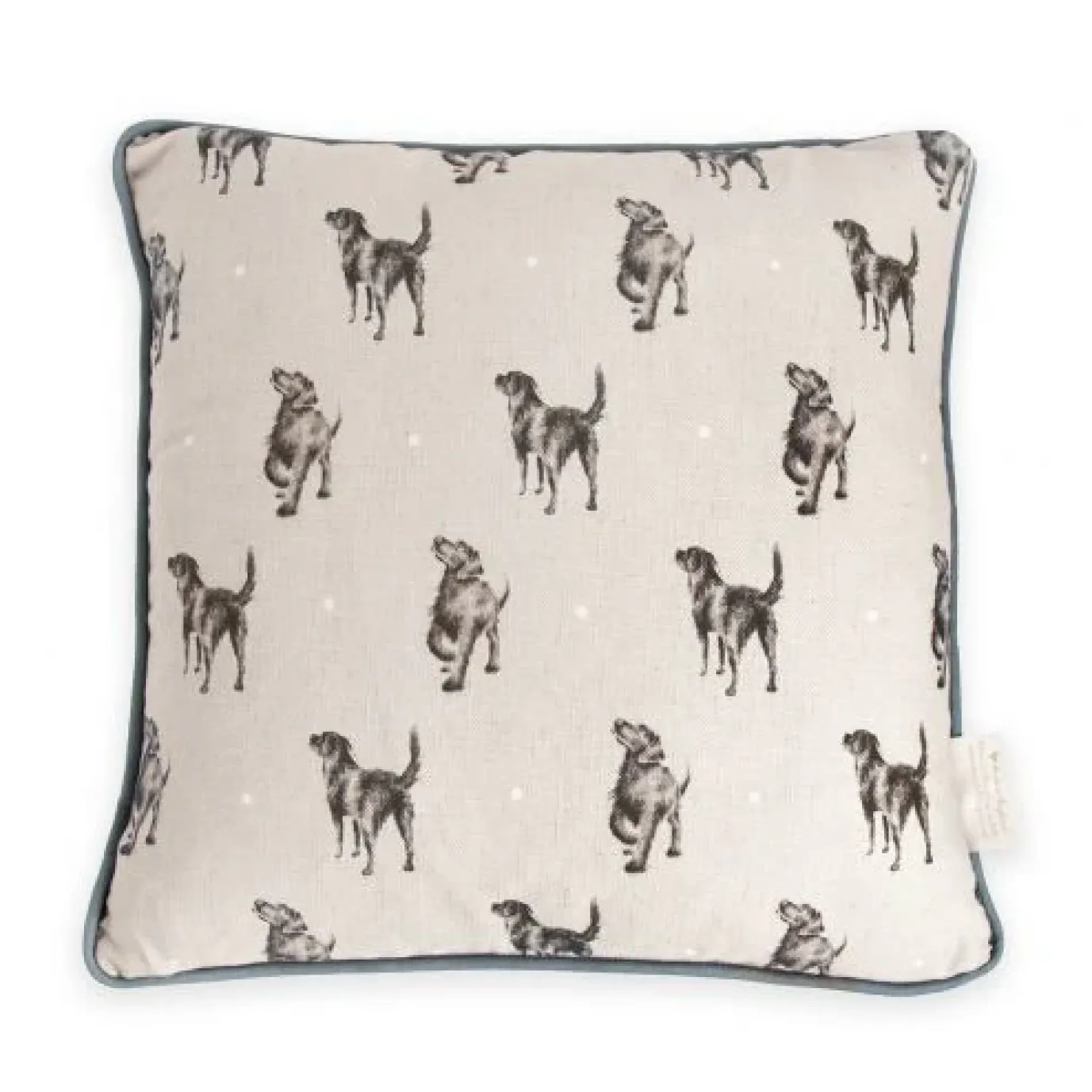 This gorgeous decorative pillow features the ‘Walkies’ dog. The decorative pillow has piping around the edge in a charcoal grey hue which compliments beautifully. The design has been printed onto quality cotton-linen blend fabric with a coordinating design on the reverse and is feather filled. Proudly ‘Made in England’ it measures 16 inch square.
