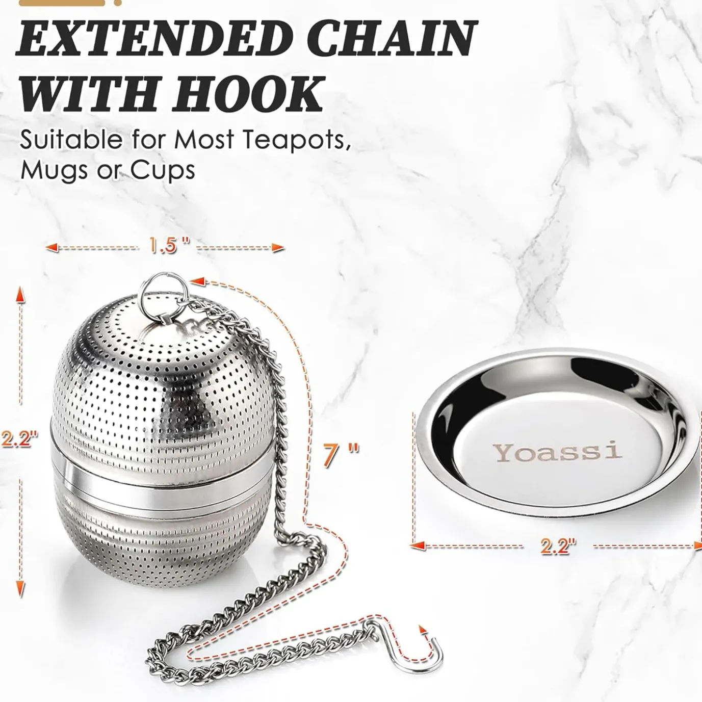 Yoassi tea steeper has an extended 7” chain with S-handle so it can be attached securely on any rim of mugs, cups, teapots, kettles, bottles, and pitchers.